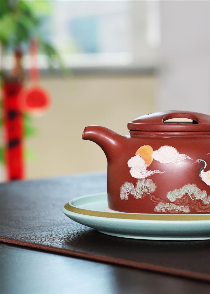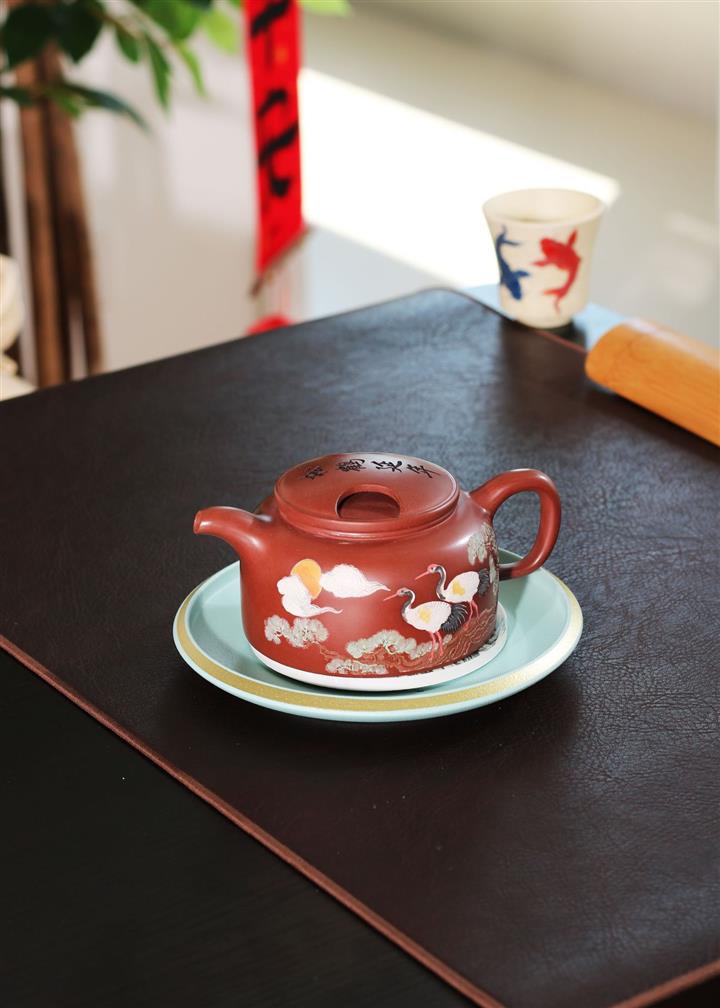 300cc大紅袍堆繪松鶴延年牛蓋蓮子茶壺POT8190