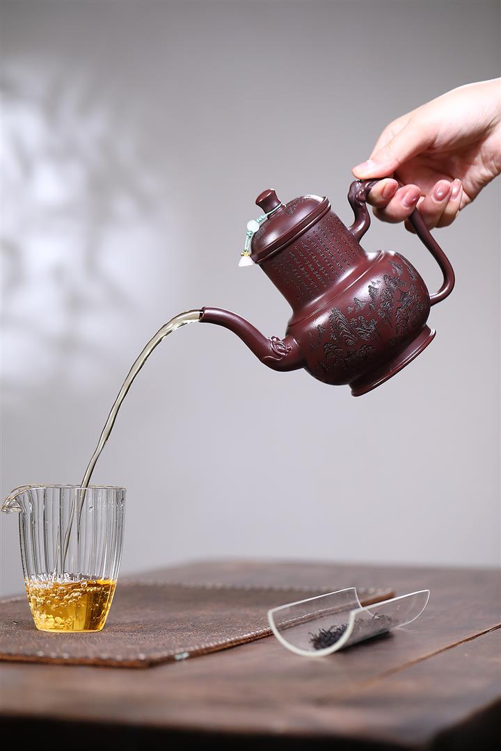 【作品介紹】此款壺形線條流暢,壺把,壺嘴,壺身壹氣呵成栩栩如生,是收藏把玩的好壺,泥料色澤古樸典雅,日久使用,漸露鋒芒,養成變化快,溫潤莊重,用其泡茶,使用的年代久,壺身就溫潤,泡出來的茶湯也就醇郁芳馨。