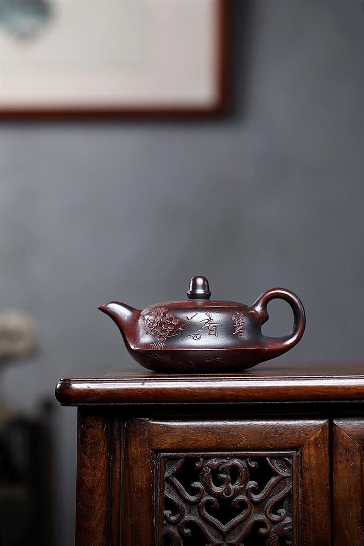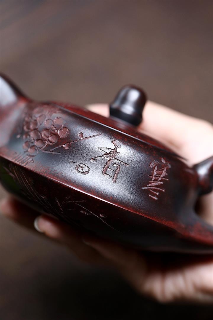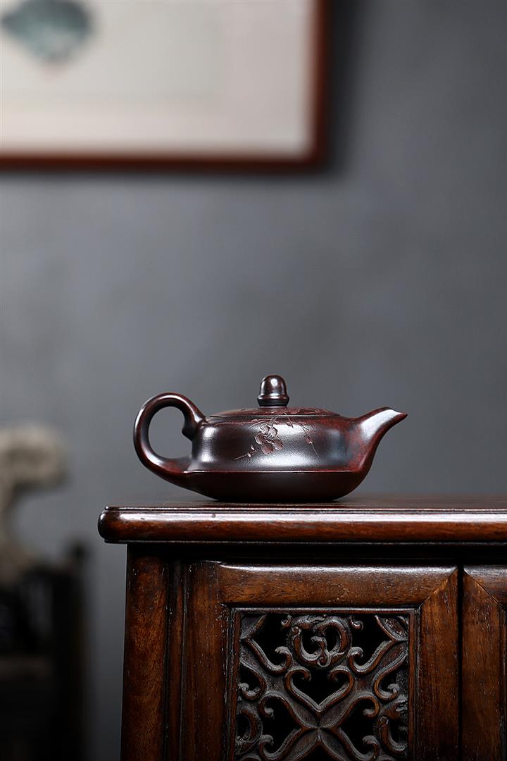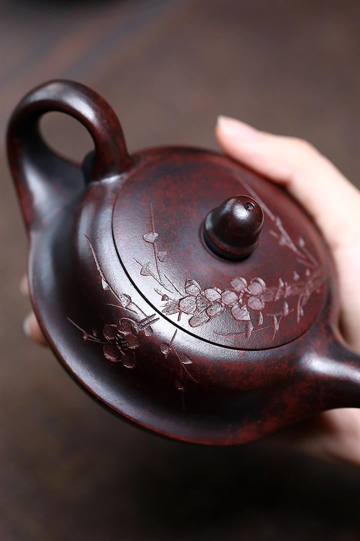 【泥料特點】砂土氣重,似淳實農民,日久使用,漸露鋒芒,養成變化,溫潤莊重。紫砂是壹種雙重氣孔結構的多孔性材質,氣孔微細,密度高。用紫砂壺沏茶,不失原味,且香不渙散,得茶之真香真味。紫砂使用越久,壺身色澤越發光亮照人,氣韻溫雅。紫砂壺長久使用器身會因撫摸擦拭,變得越發溫潤光澤。