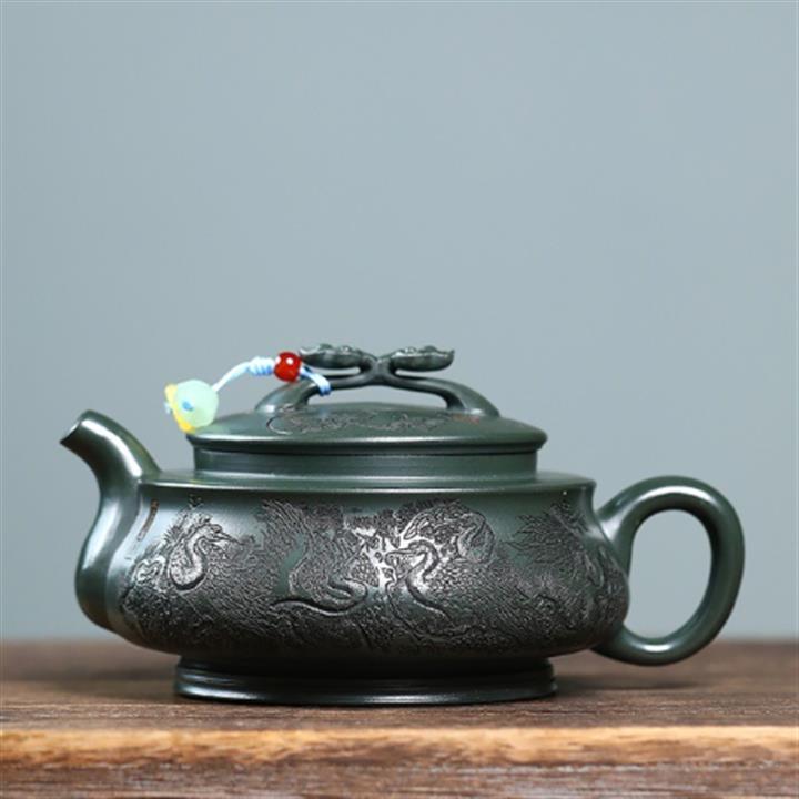 330cc原礦墨綠泥滿刻如意清荷茶壺POT8301