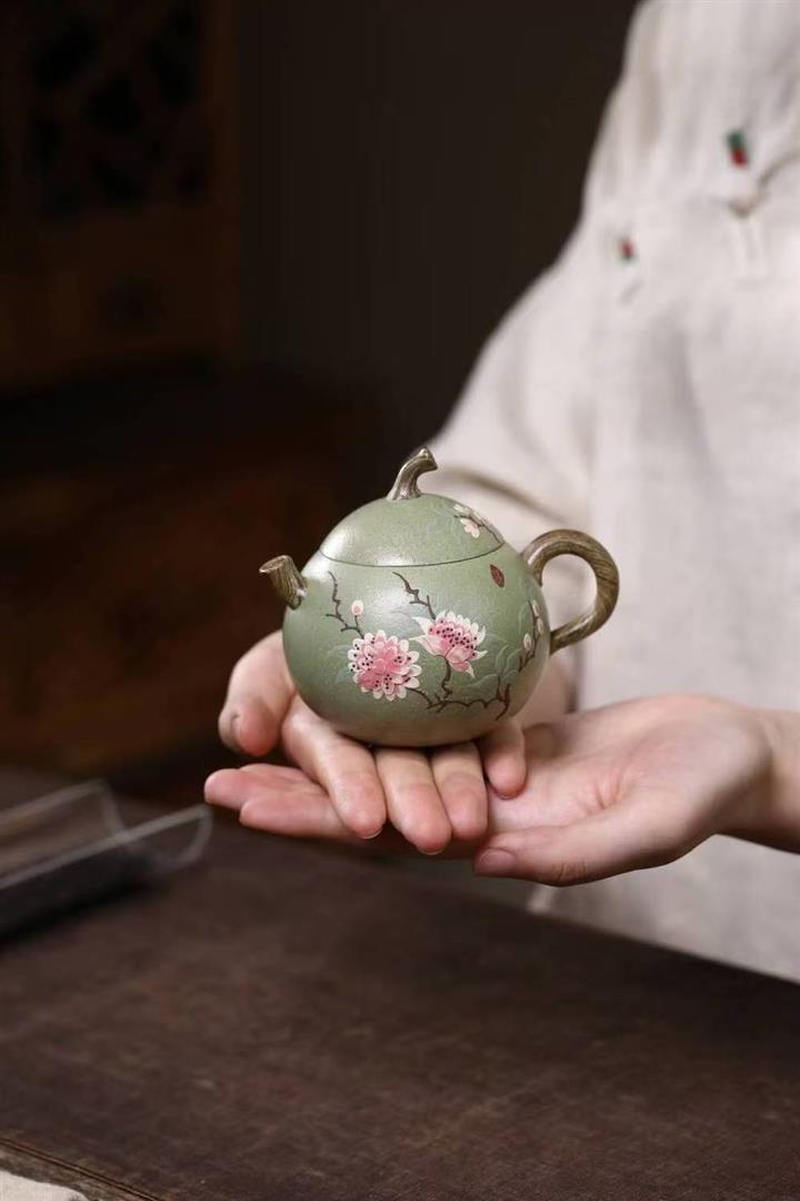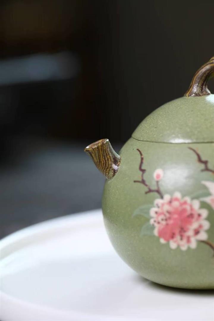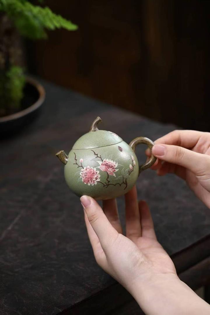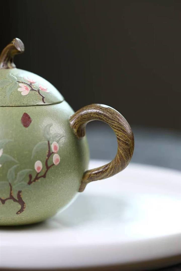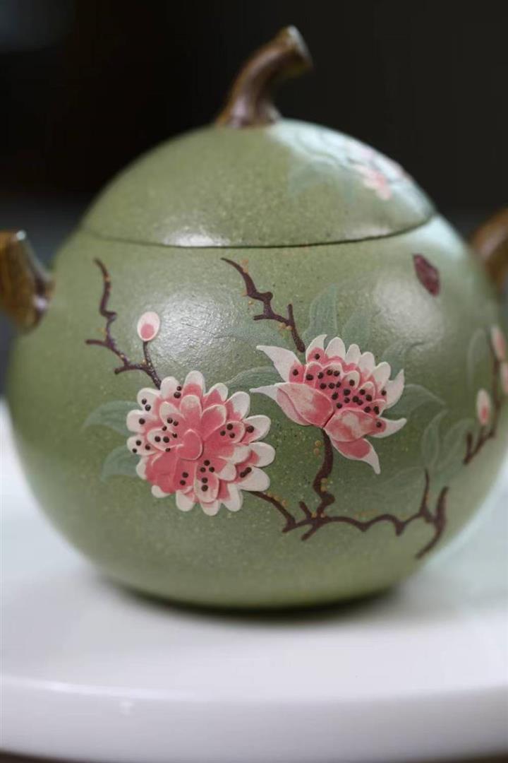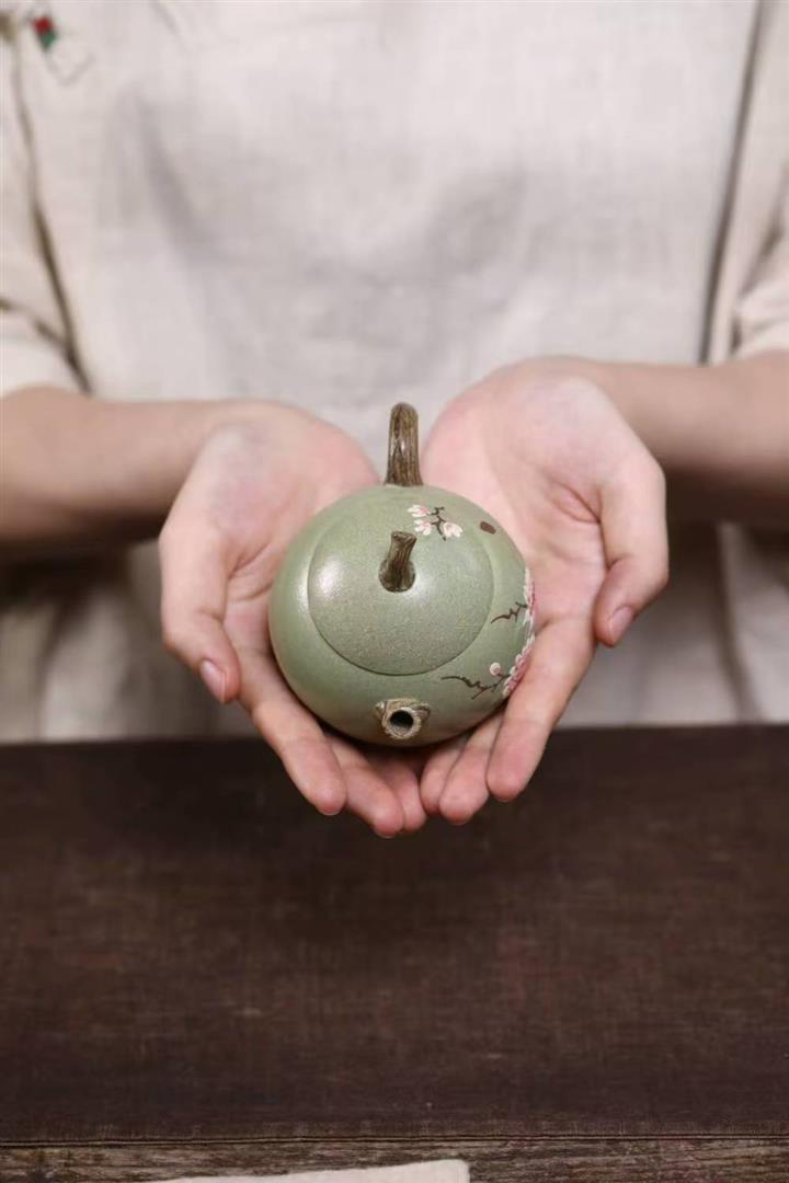 160cc原礦豆青砂泥雙色桃花茄瓜茶壺POT8577