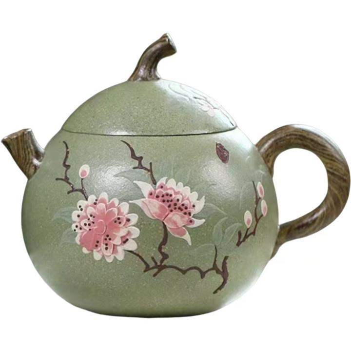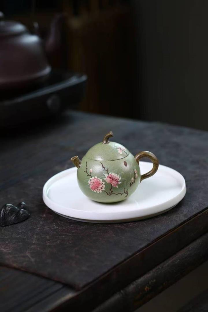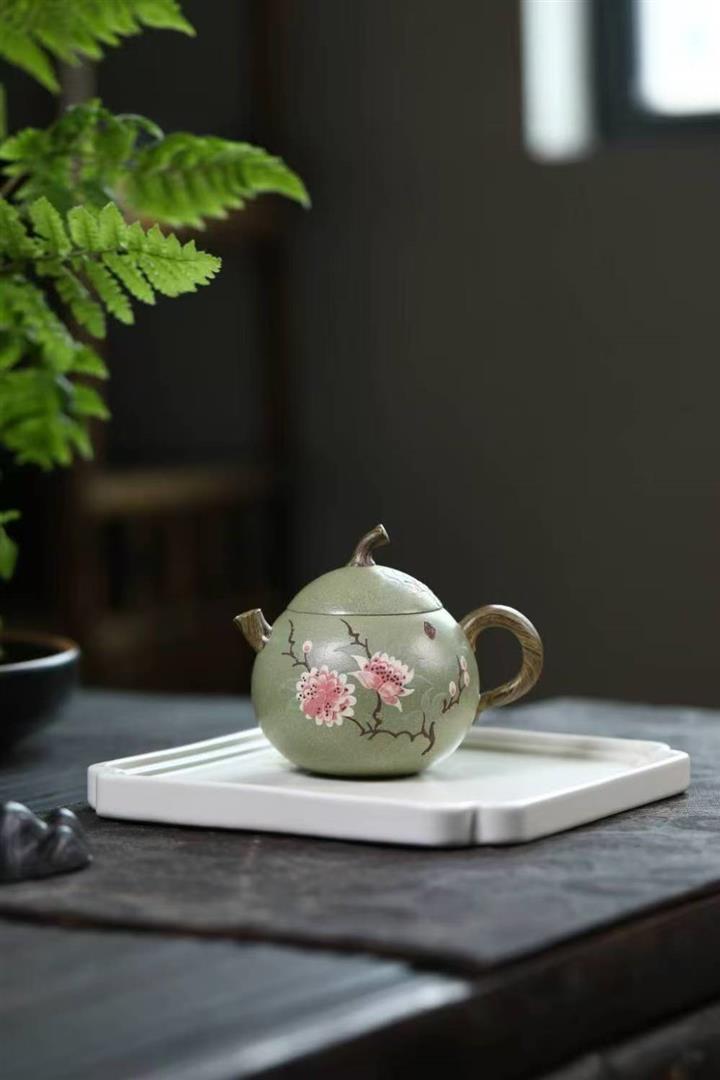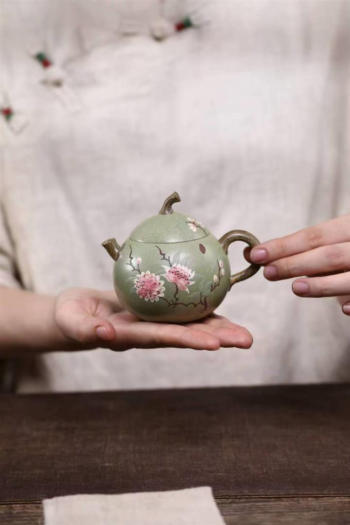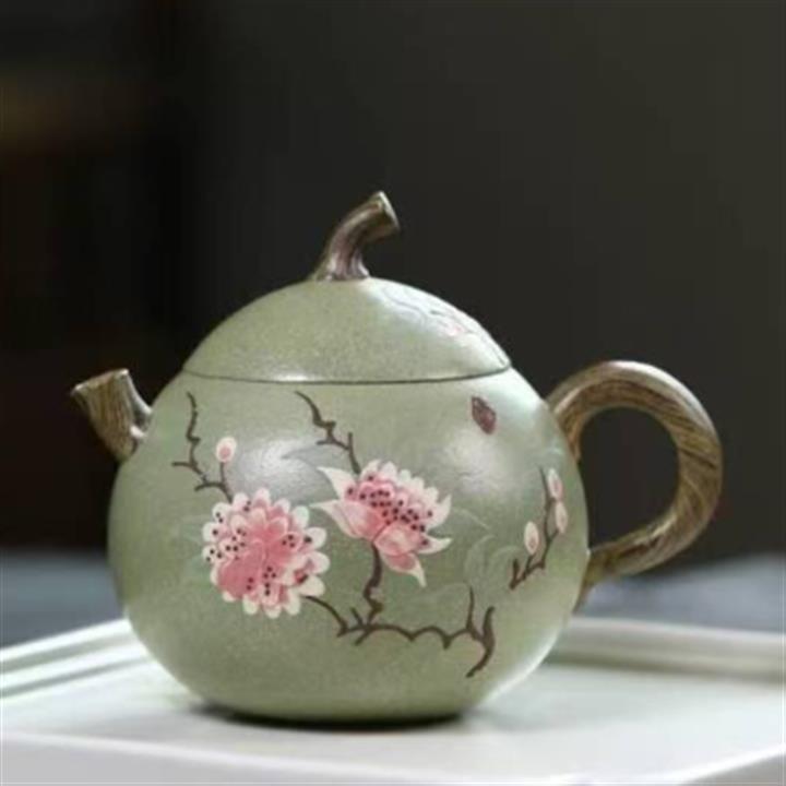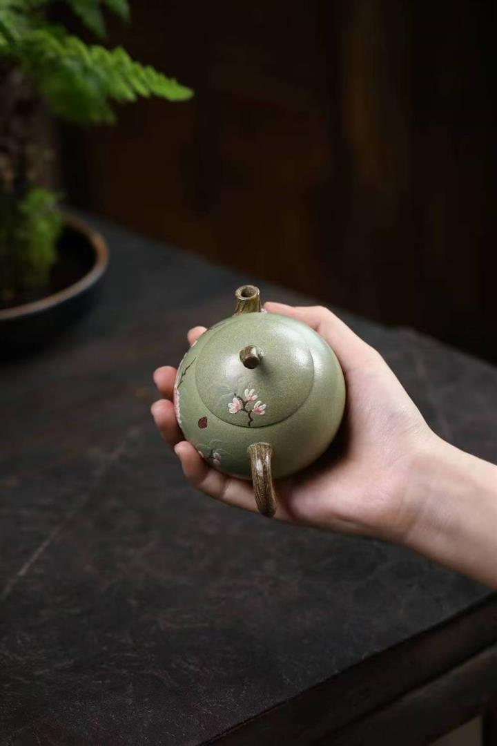 160cc原礦豆青砂泥雙色桃花茄瓜茶壺POT8577