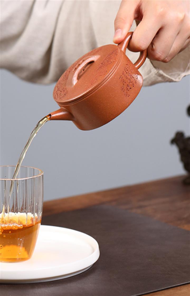 【泥料特點】砂土氣重,似淳實農民,日久使用,漸露鋒芒,養成變化,溫潤莊重。紫砂是壹種雙重氣孔結構的多孔性材質,氣孔微細,密度高。用紫砂壺沏茶,不失原味,且香不渙散,得茶之真香真味。紫砂使用越久,壺身色澤越發光亮照人,氣韻溫雅。紫砂壺長久使用器身會因撫摸擦拭,變得越發溫潤光澤。