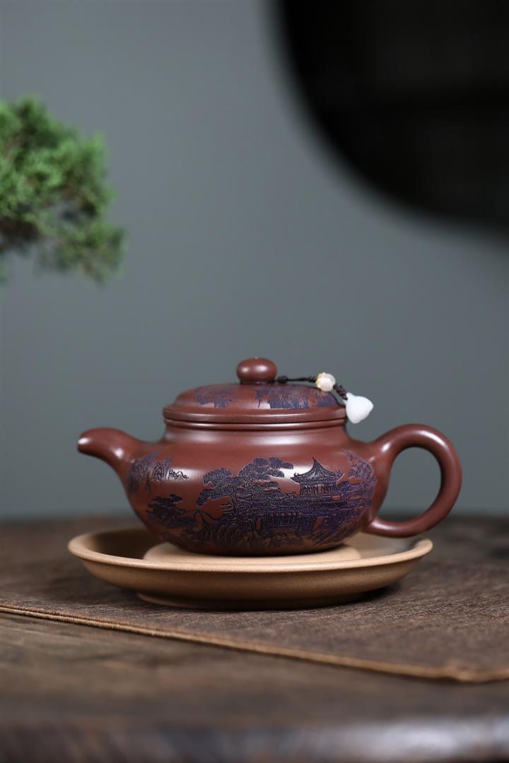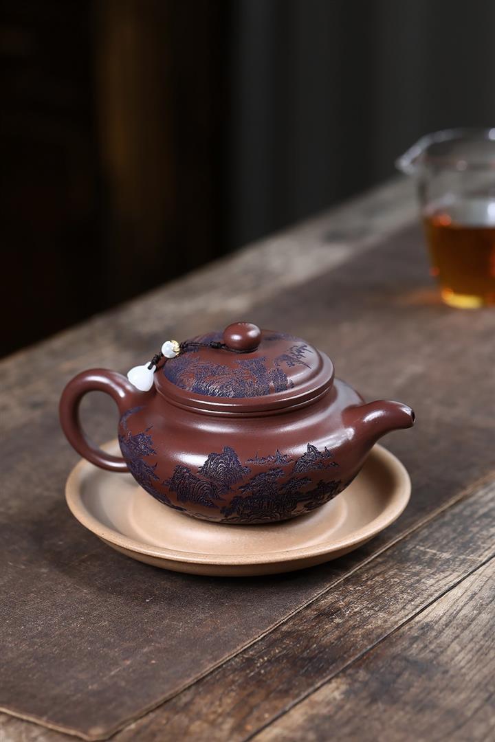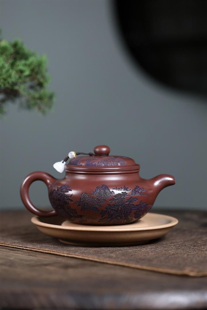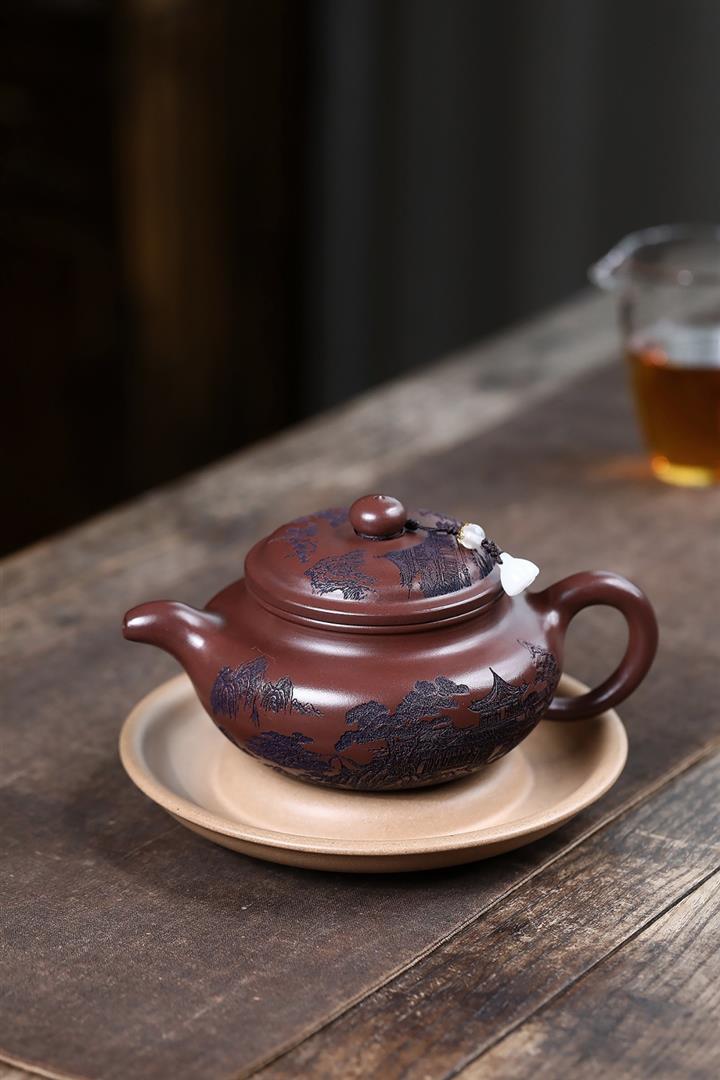 原礦鐵血紅砂刻字寒江茶壺POT7627