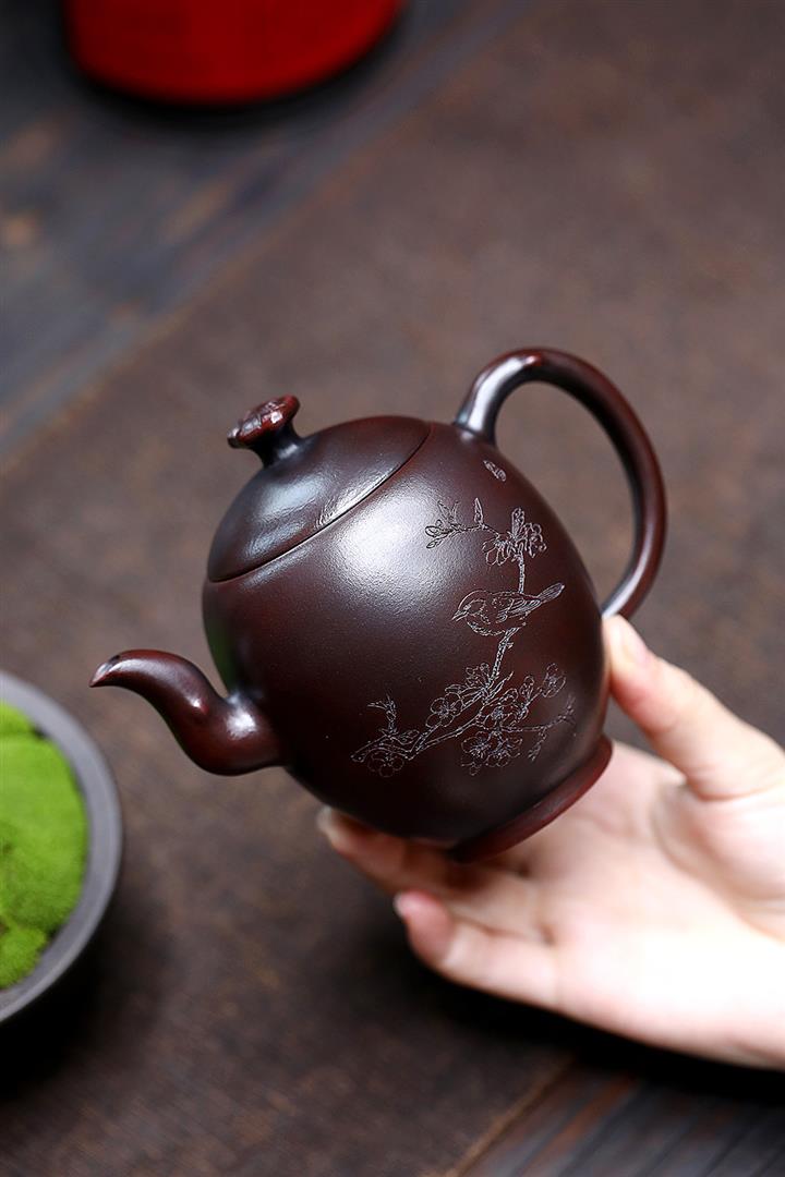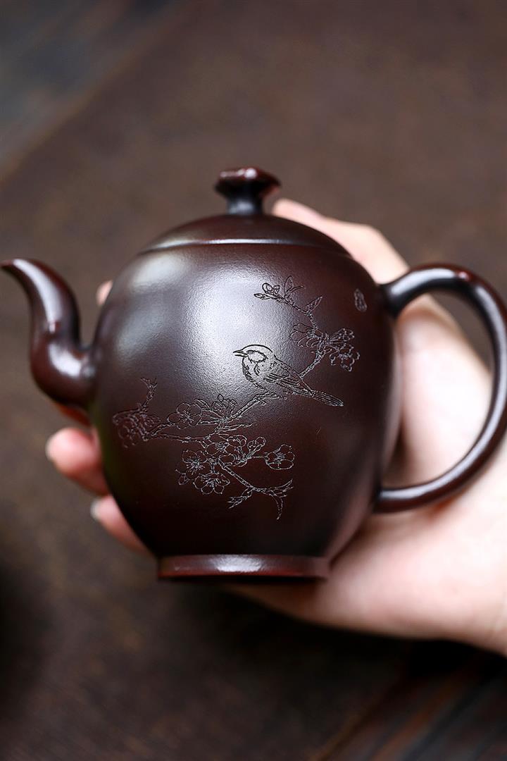 【泥料特點】砂土氣重,似淳實農民,日久使用,漸露鋒芒,養成變化,溫潤莊重。紫砂是壹種雙重氣孔結構的多孔性材質,氣孔微細,密度高。用紫砂壺沏茶,不失原味,且香不渙散,得茶之真香真味。紫砂使用越久,壺身色澤越發光亮照人,氣韻溫雅。紫砂壺長久使用器身會因撫摸擦拭,變得越發溫潤光澤。