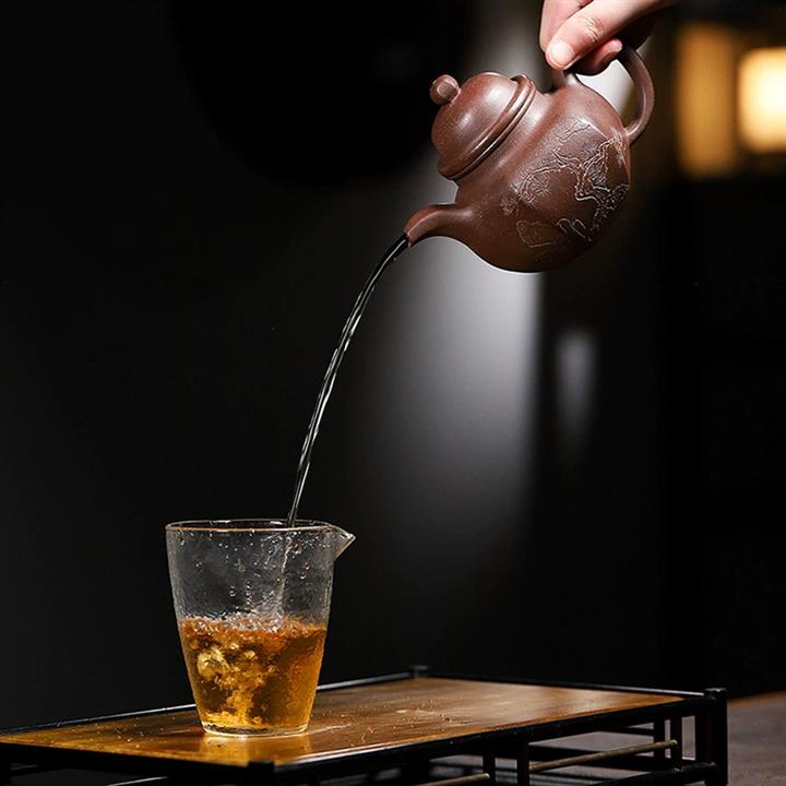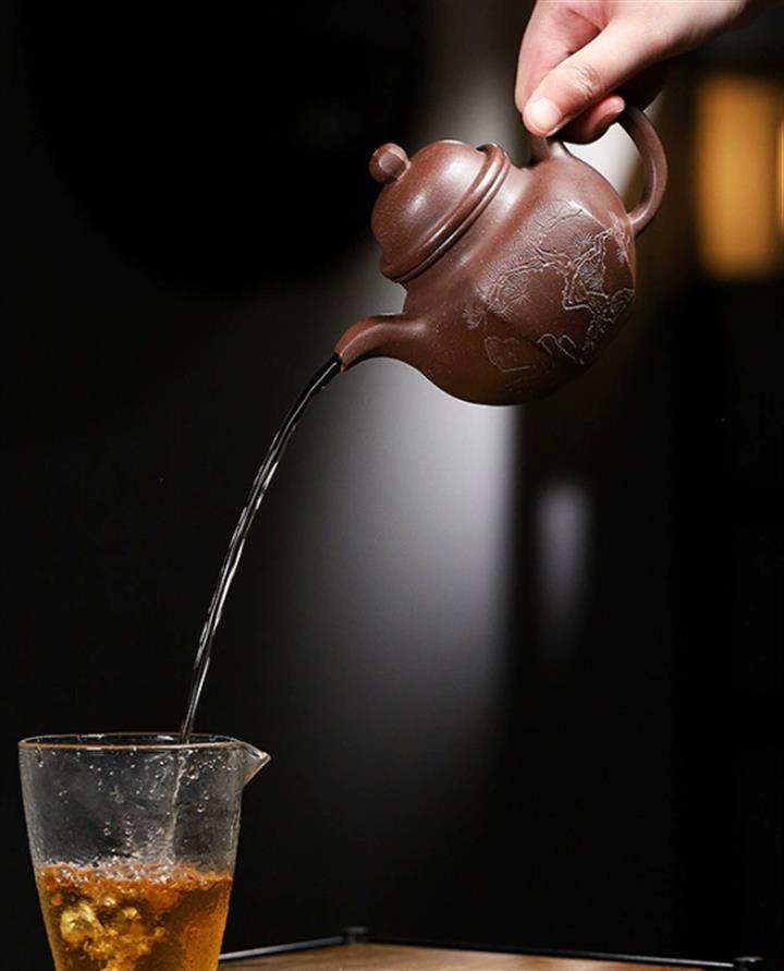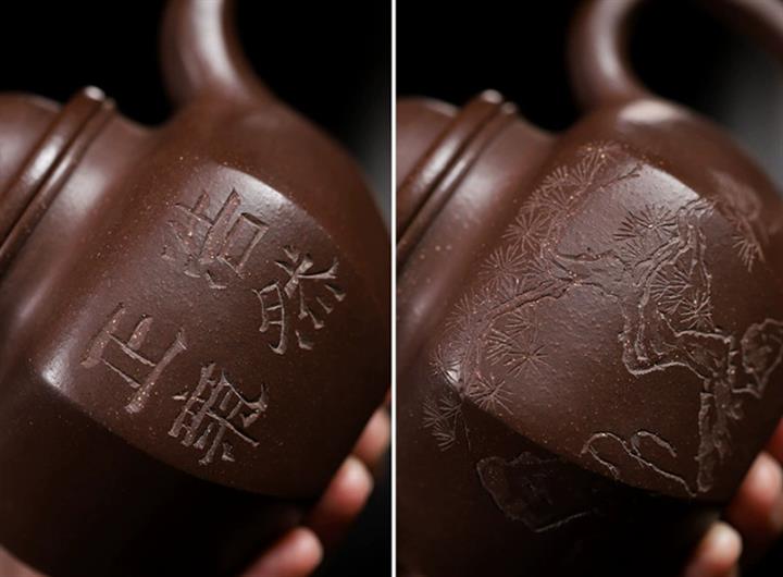 【泥料特點】砂土氣重,似淳實農民,日久使用,漸露鋒芒,養成變化,溫潤莊重。紫砂是壹種雙重氣孔結構的多孔性材質,氣孔微細,密度高。用紫砂壺沏茶,不失原味,且香不渙散,得茶之真香真味。紫砂使用越久,壺身色澤越發光亮照人,氣韻溫雅。紫砂壺長久使用器身會因撫摸擦拭,變得越發溫潤光澤。