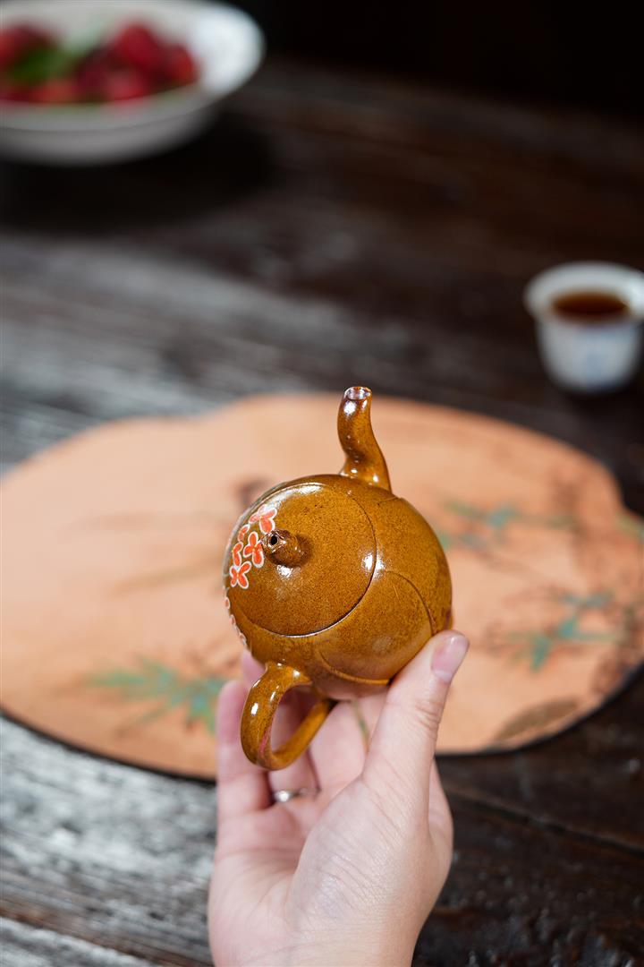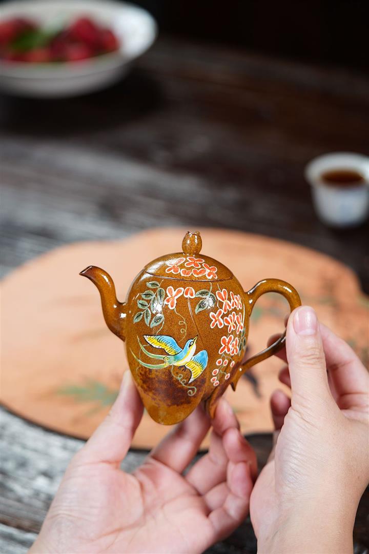 【泥料特點】砂土氣重,似淳實農民,日久使用,漸露鋒芒,養成變化,溫潤莊重。紫砂是壹種雙重氣孔結構的多孔性材質,氣孔微細,密度高。用紫砂壺沏茶,不失原味,且香不渙散,得茶之真香真味。紫砂使用越久,壺身色澤越發光亮照人,氣韻溫雅。紫砂壺長久使用器身會因撫摸擦拭,變得越發溫潤光澤。
