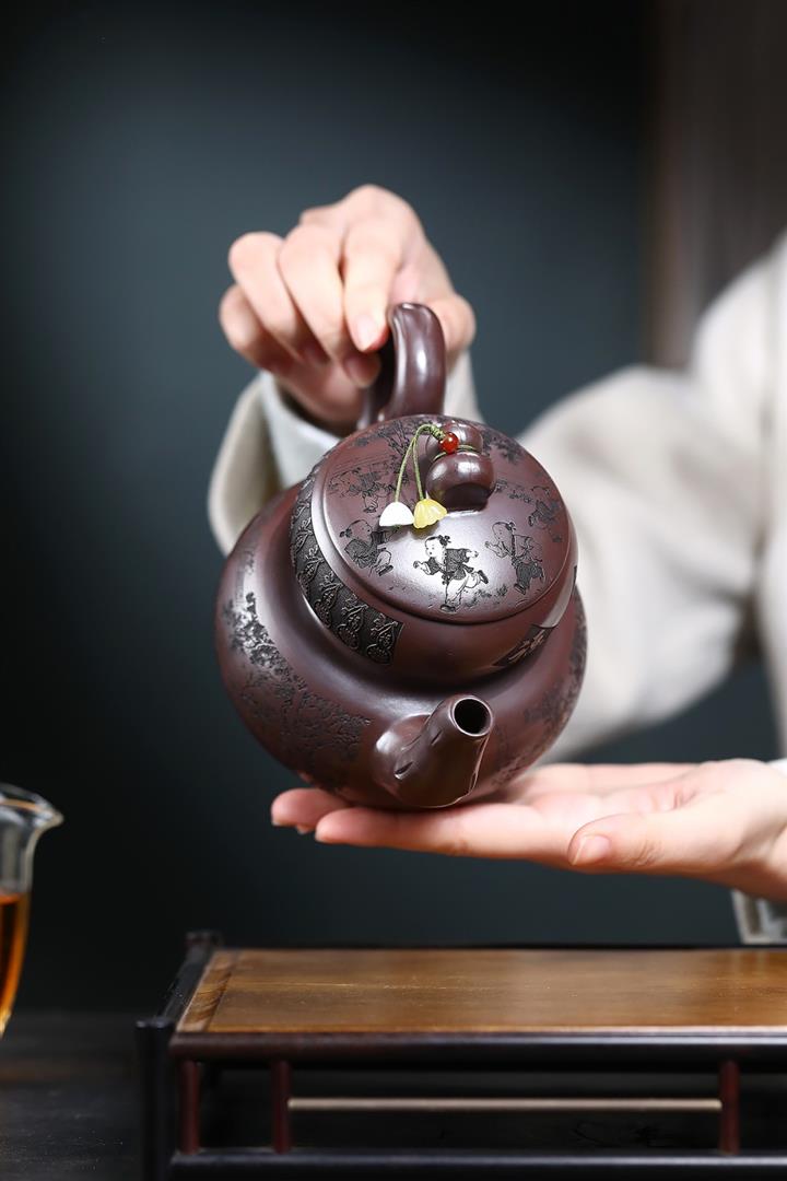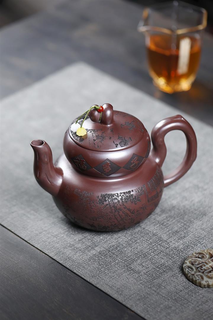 【作品介紹】此款壺形線條流暢,壺把,壺嘴,壺身壹氣呵成栩栩如生,是收藏把玩的好壺,泥料色澤古樸典雅,日久使用,漸露鋒芒,養成變化快,溫潤莊重,用其泡茶,使用的年代久,壺身就溫潤,泡出來的茶湯也就醇郁芳馨。
