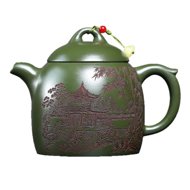 380cc原礦綠泥滿刻竹林松濤秦權茶壺POT9085