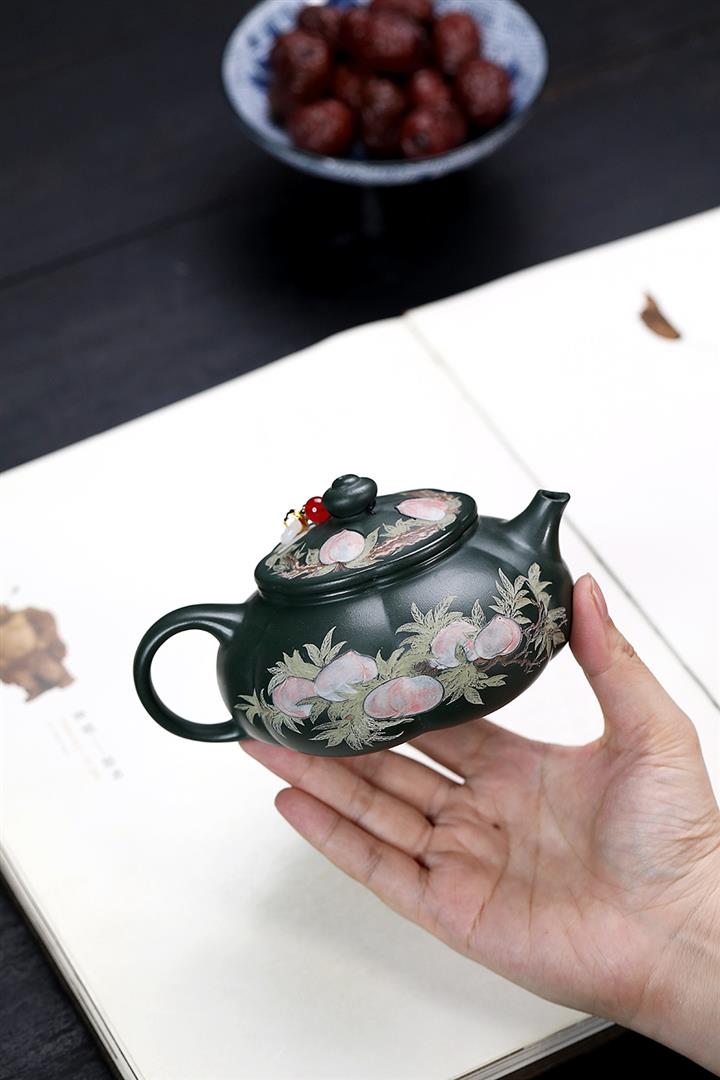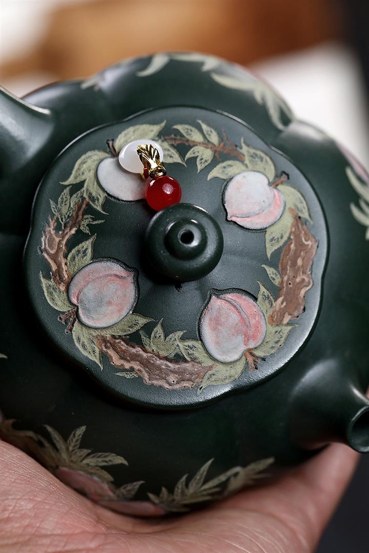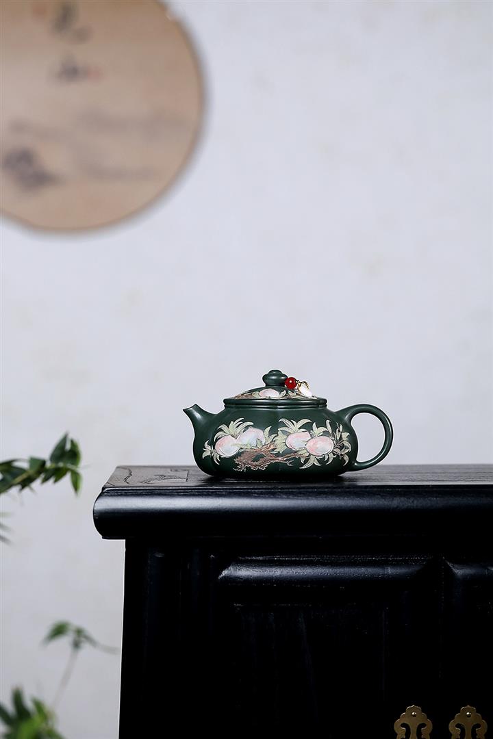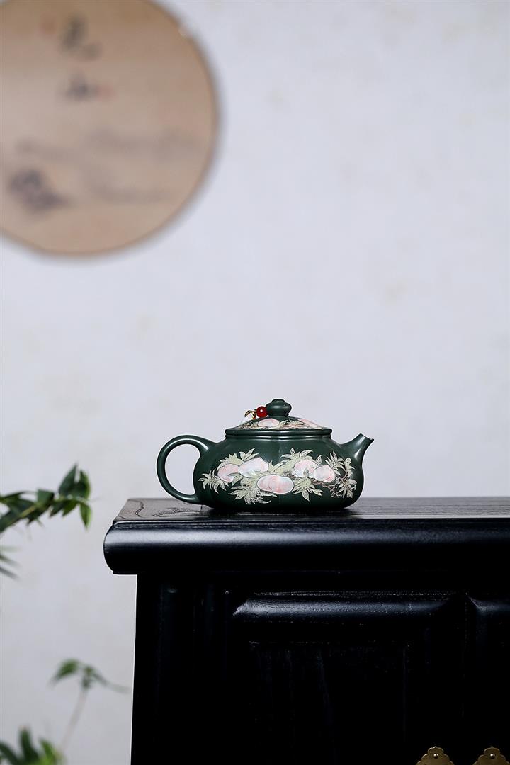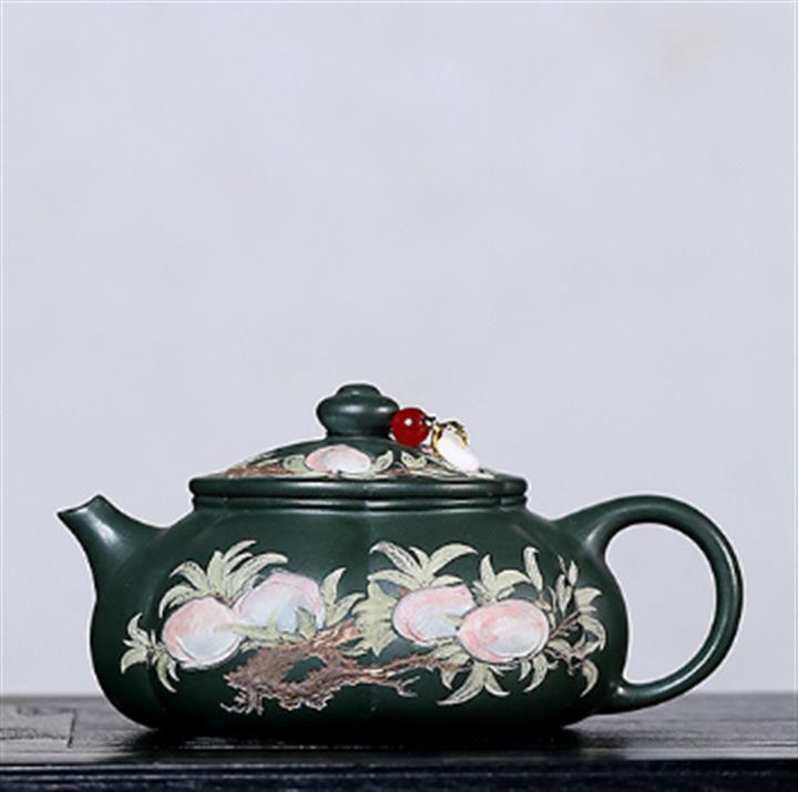 280cc原礦綠泥彩繪壽桃寒江泡茶壺POT9130