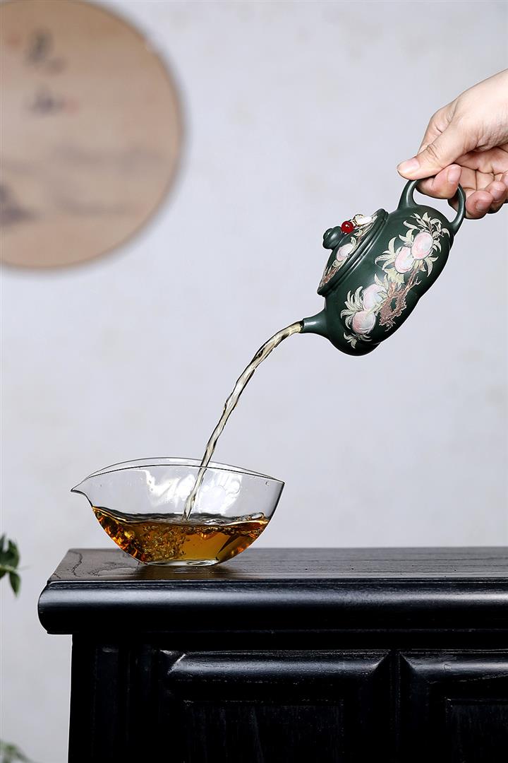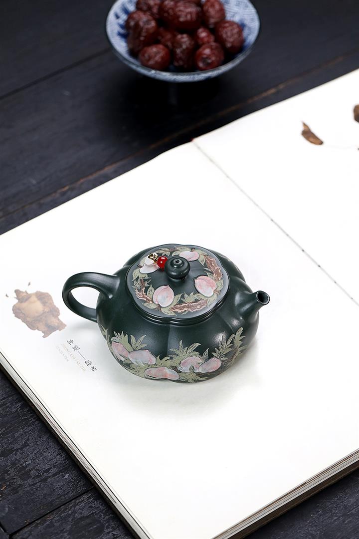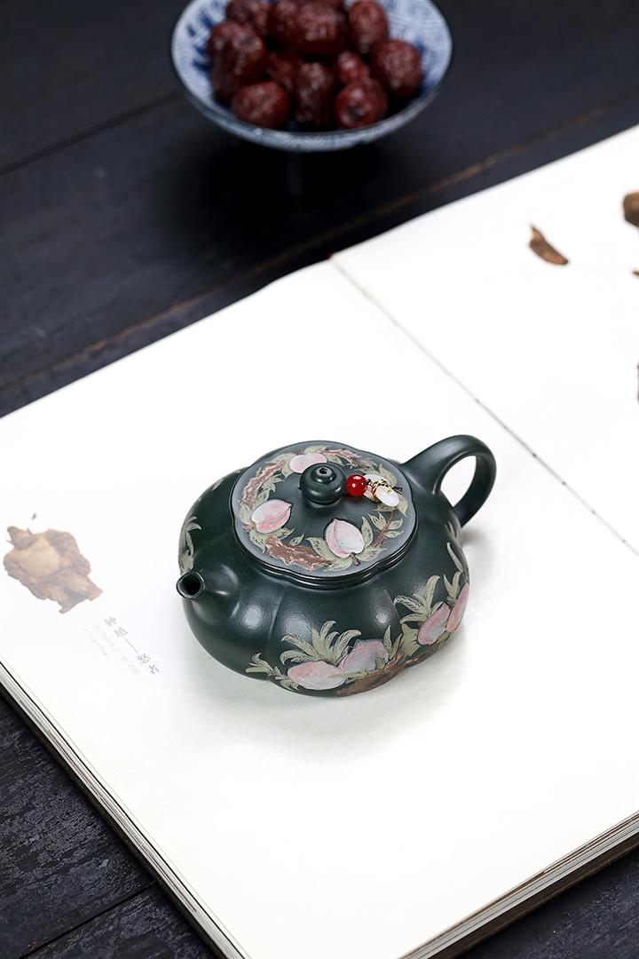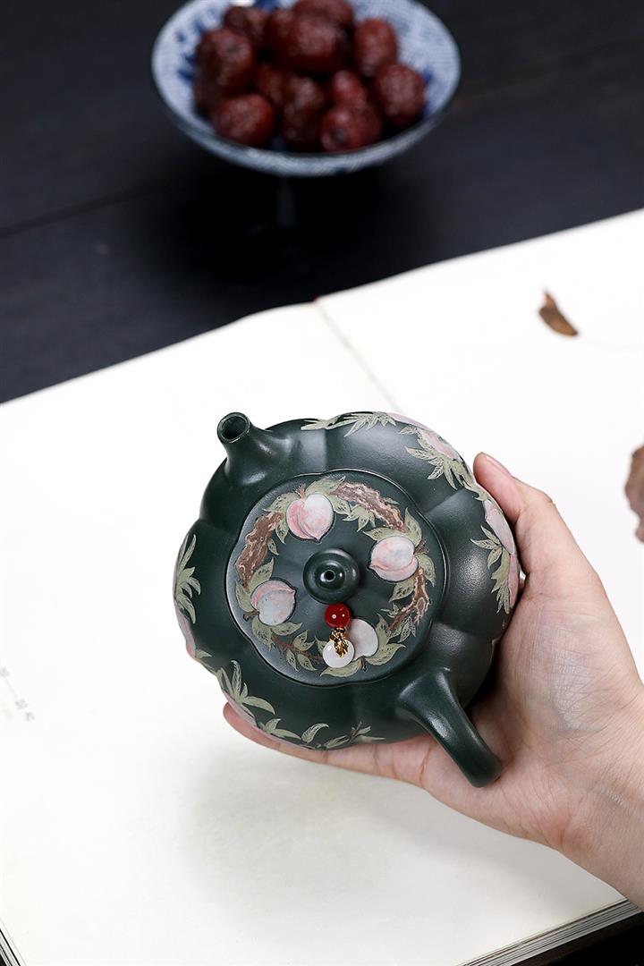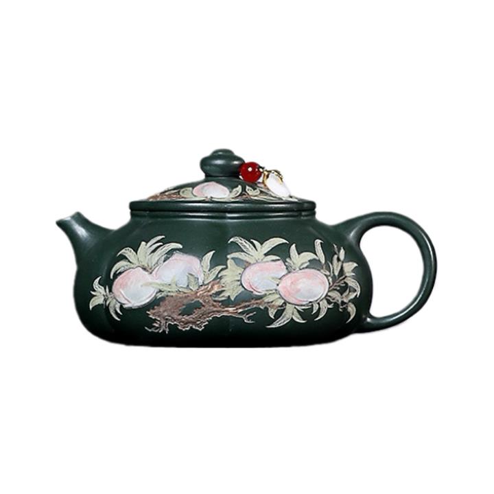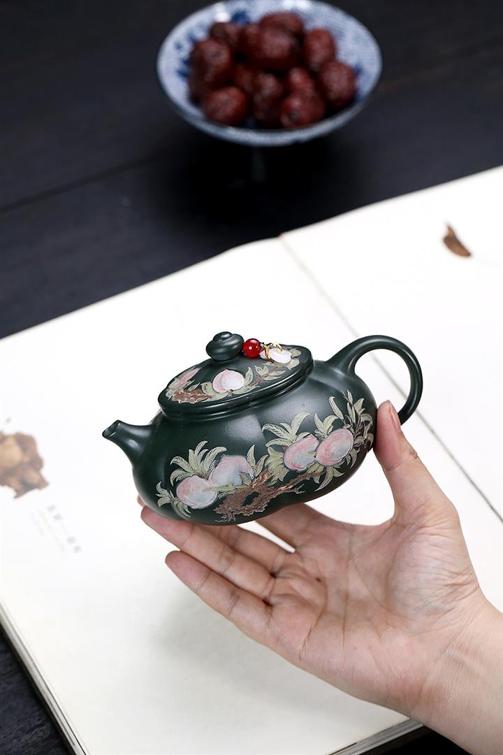 280cc原礦綠泥彩繪壽桃寒江泡茶壺POT9130