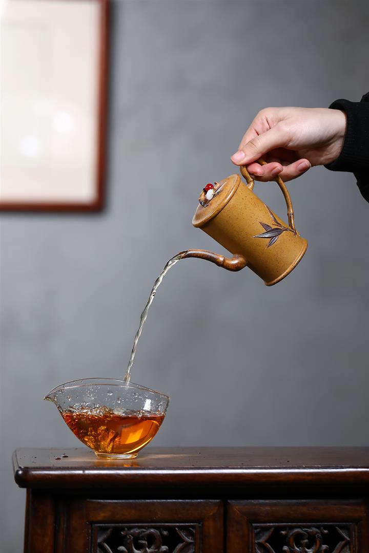 【泥料特點】砂土氣重,似淳實農民,日久使用,漸露鋒芒,養成變化,溫潤莊重。紫砂是壹種雙重氣孔結構的多孔性材質,氣孔微細,密度高。用紫砂壺沏茶,不失原味,且香不渙散,得茶之真香真味。紫砂使用越久,壺身色澤越發光亮照人,氣韻溫雅。紫砂壺長久使用器身會因撫摸擦拭,變得越發溫潤光澤。