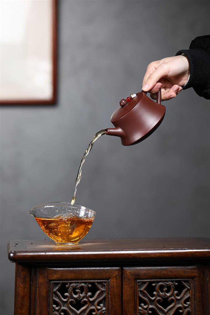 【泥料特點】砂土氣重,似淳實農民,日久使用,漸露鋒芒,養成變化,溫潤莊重。紫砂是壹種雙重氣孔結構的多孔性材質,氣孔微細,密度高。用紫砂壺沏茶,不失原味,且香不渙散,得茶之真香真味。紫砂使用越久,壺身色澤越發光亮照人,氣韻溫雅。紫砂壺長久使用器身會因撫摸擦拭,變得越發溫潤光澤。