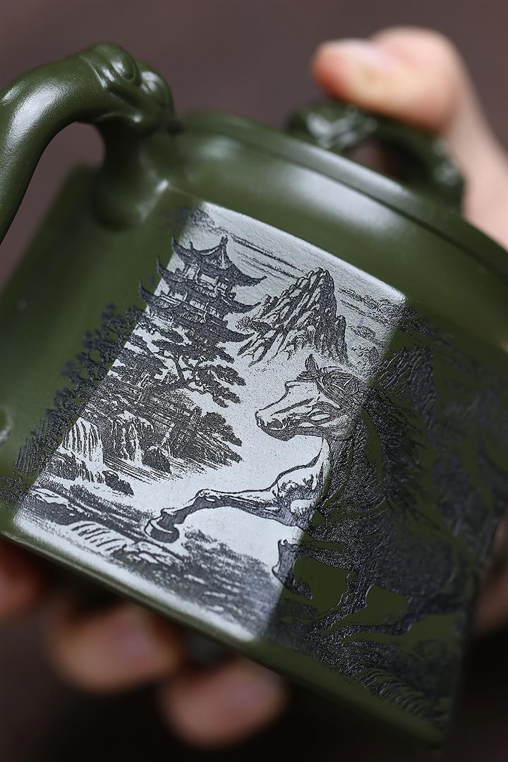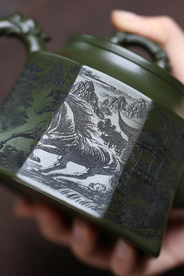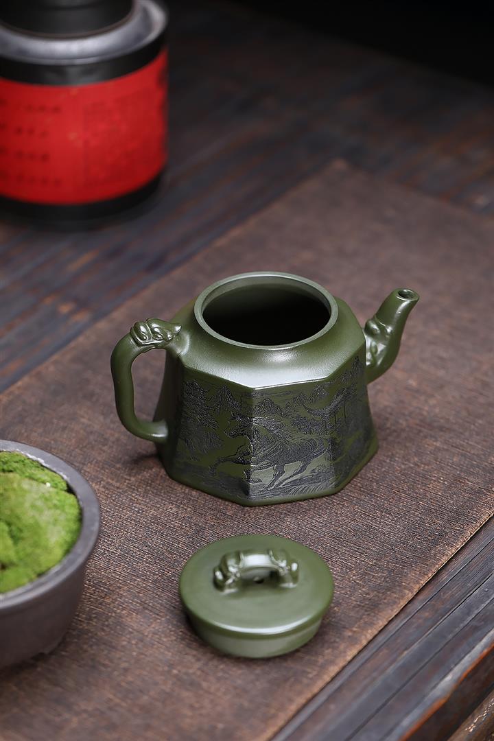 330cc原礦墨綠泥滿刻如意清荷茶壺POT8301