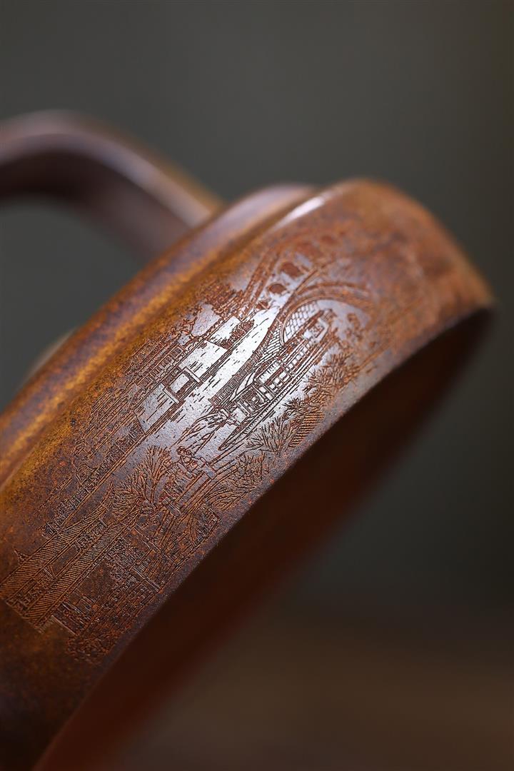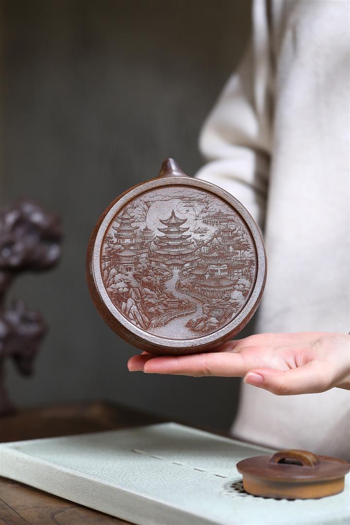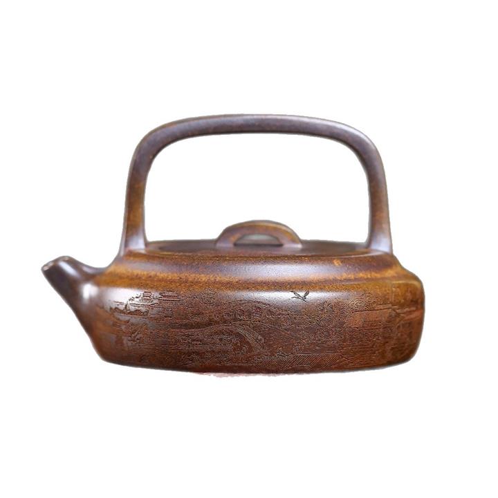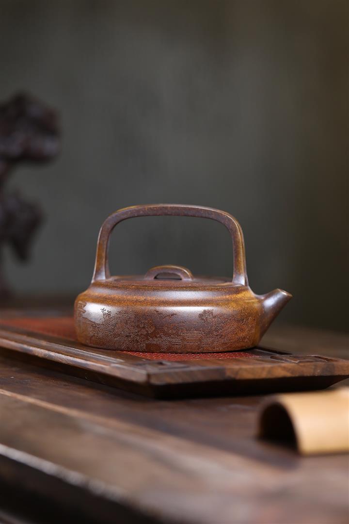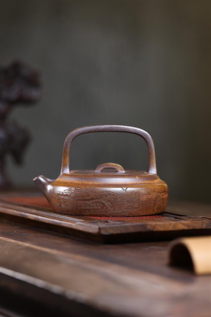 410cc原礦石黃泥彩刻蓬萊勝景茶壺POT8988