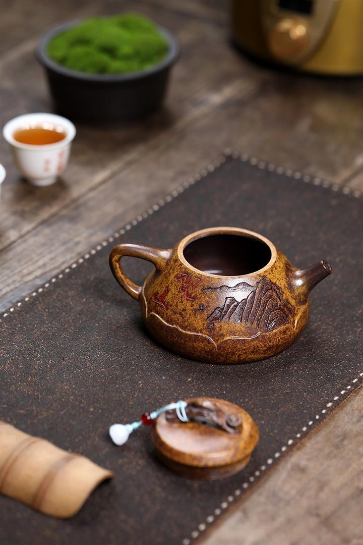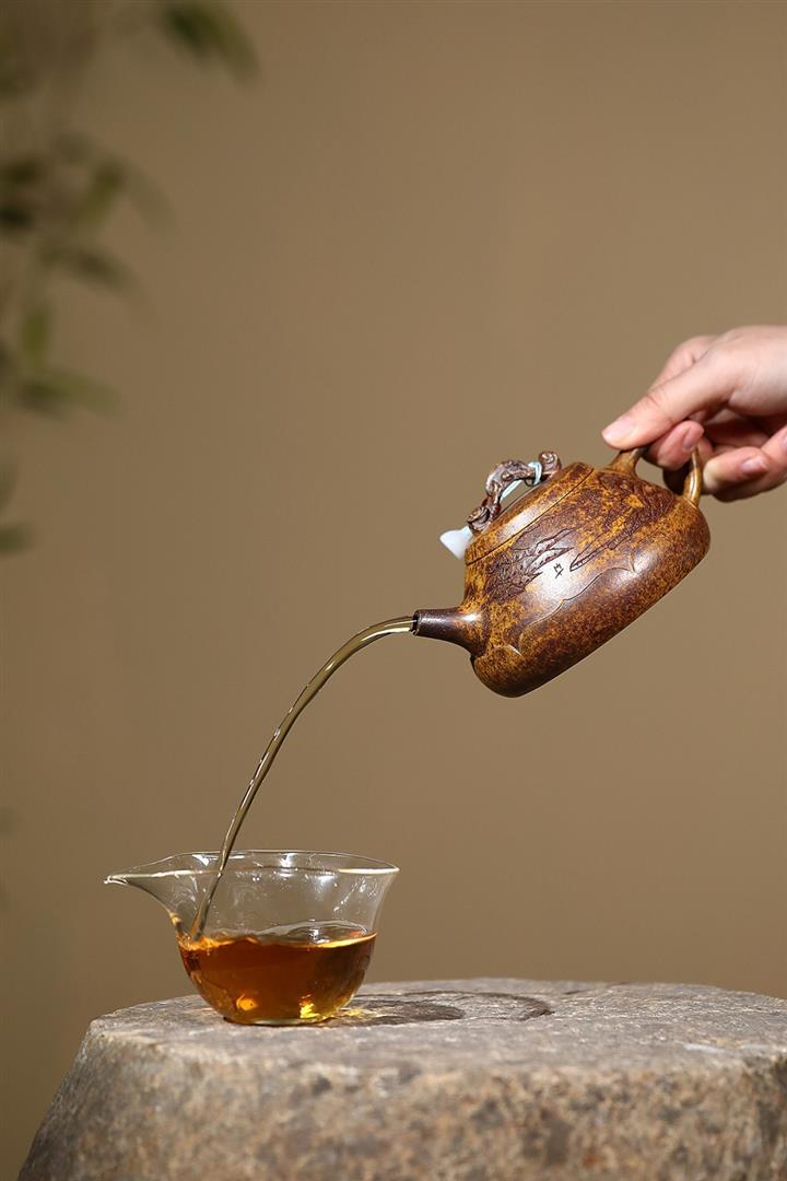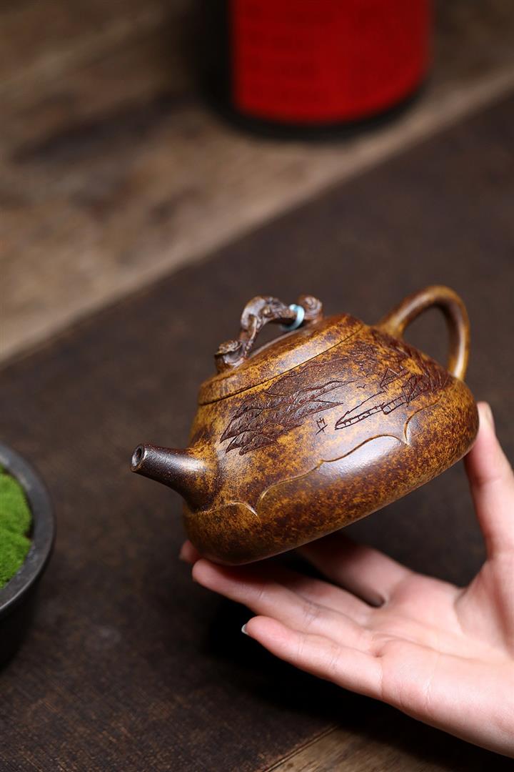 【泥料特點】砂土氣重,似淳實農民,日久使用,漸露鋒芒,養成變化,溫潤莊重。紫砂是壹種雙重氣孔結構的多孔性材質,氣孔微細,密度高。用紫砂壺沏茶,不失原味,且香不渙散,得茶之真香真味。紫砂使用越久,壺身色澤越發光亮照人,氣韻溫雅。紫砂壺長久使用器身會因撫摸擦拭,變得越發溫潤光澤。