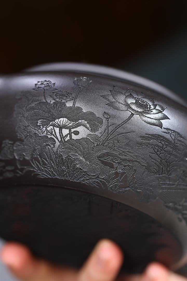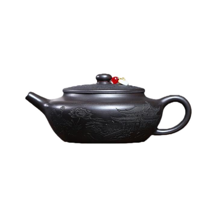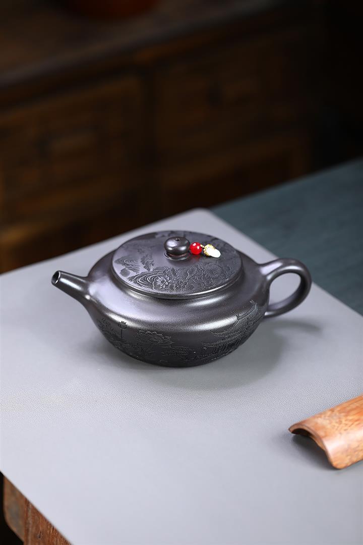 330cc原礦墨綠泥滿刻如意清荷茶壺POT8301