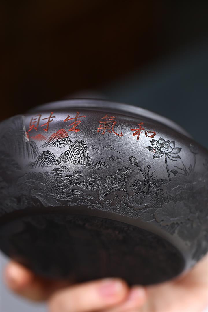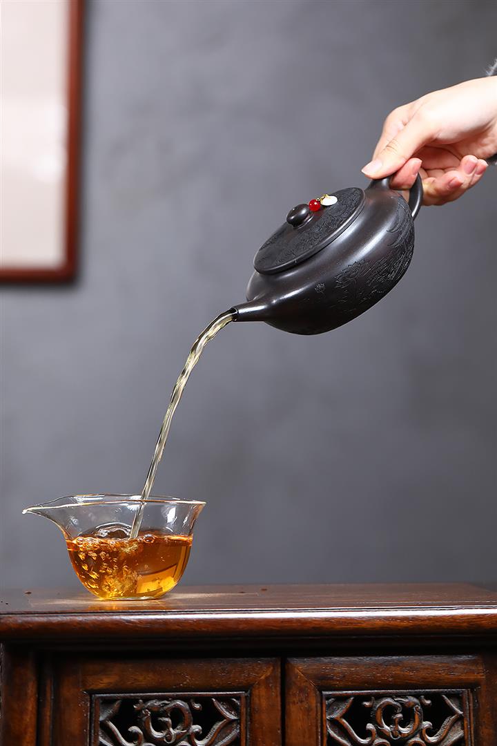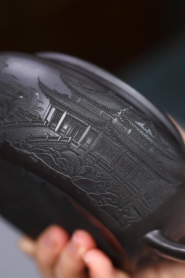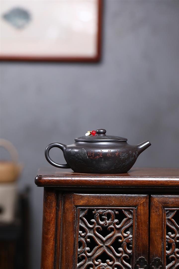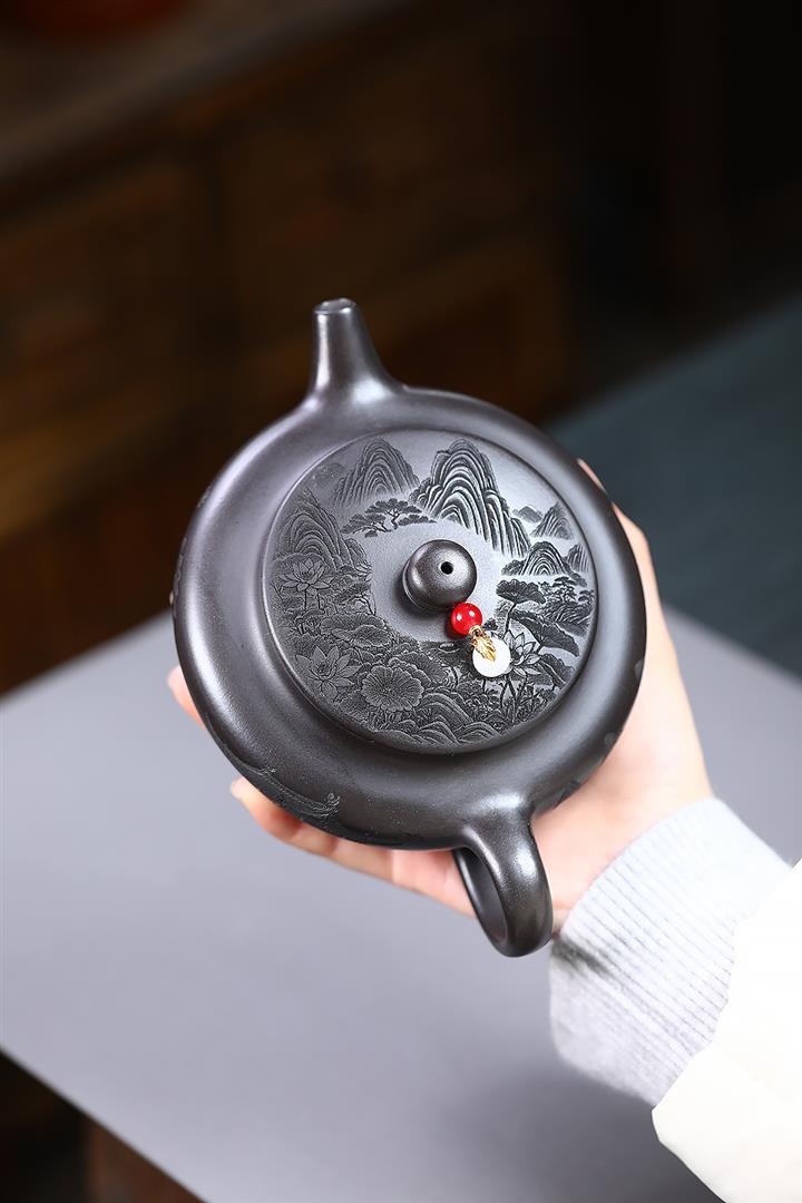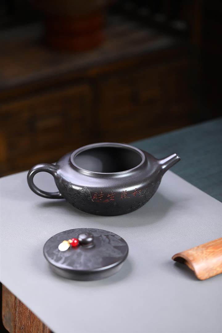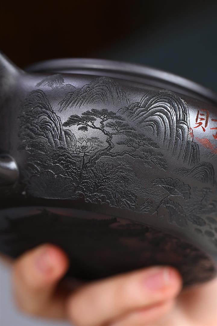400cc原礦墨綠泥刻繪如意松趣茶壺POT8304