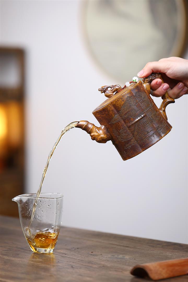 【泥料特點】砂土氣重,似淳實農民,日久使用,漸露鋒芒,養成變化,溫潤莊重。紫砂是壹種雙重氣孔結構的多孔性材質,氣孔微細,密度高。用紫砂壺沏茶,不失原味,且香不渙散,得茶之真香真味。紫砂使用越久,壺身色澤越發光亮照人,氣韻溫雅。紫砂壺長久使用器身會因撫摸擦拭,變得越發溫潤光澤。