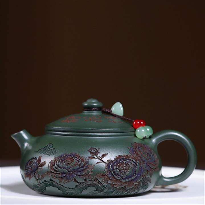 190cc原礦綠泥滿刻牡丹寒江泡茶壺POT10220