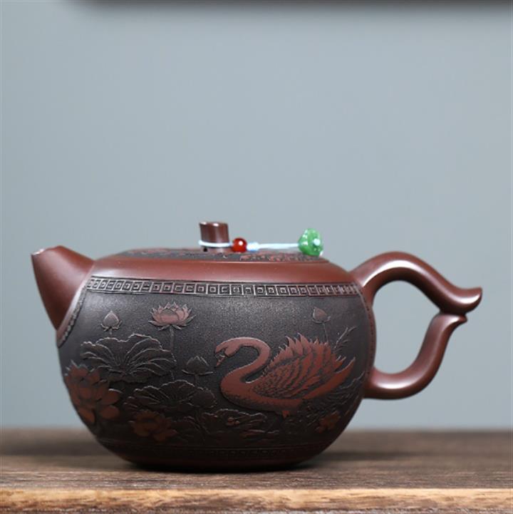 280cc原礦墨綠泥滿刻鯉躍荷塘茶壺POT8320