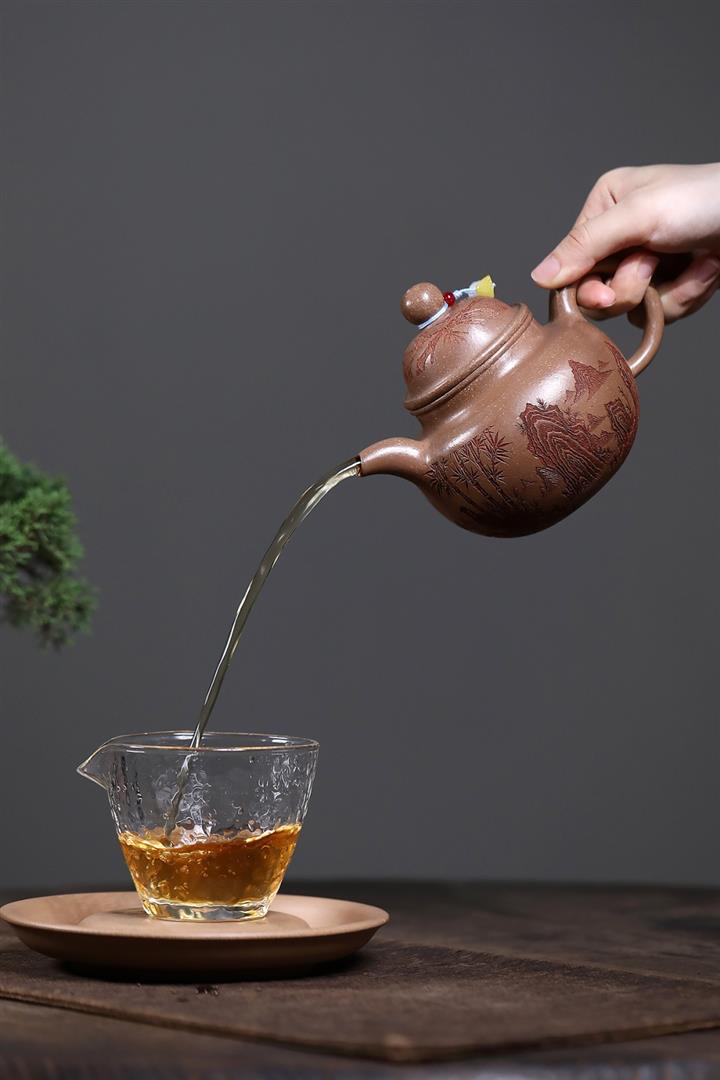 【泥料特點】砂土氣重,似淳實農民,日久使用,漸露鋒芒,養成變化,溫潤莊重。紫砂是壹種雙重氣孔結構的多孔性材質,氣孔微細,密度高。用紫砂壺沏茶,不失原味,且香不渙散,得茶之真香真味。紫砂使用越久,壺身色澤越發光亮照人,氣韻溫雅。紫砂壺長久使用器身會因撫摸擦拭,變得越發溫潤光澤。