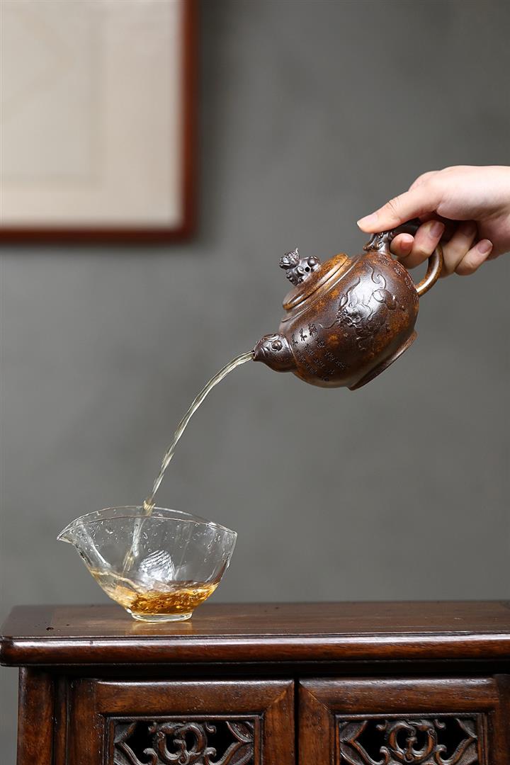 【泥料特點】砂土氣重,似淳實農民,日久使用,漸露鋒芒,養成變化,溫潤莊重。紫砂是壹種雙重氣孔結構的多孔性材質,氣孔微細,密度高。用紫砂壺沏茶,不失原味,且香不渙散,得茶之真香真味。紫砂使用越久,壺身色澤越發光亮照人,氣韻溫雅。紫砂壺長久使用器身會因撫摸擦拭,變得越發溫潤光澤。