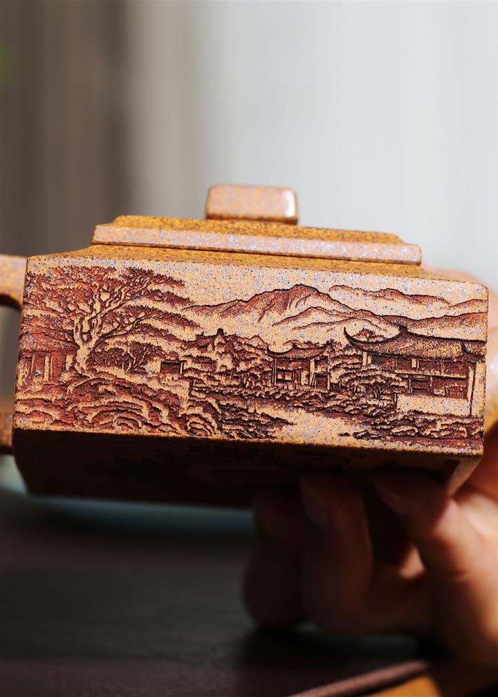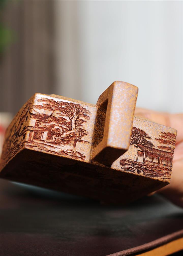 【泥料特點】砂土氣重,似淳實農民,日久使用,漸露鋒芒,養成變化,溫潤莊重。紫砂是壹種雙重氣孔結構的多孔性材質,氣孔微細,密度高。用紫砂壺沏茶,不失原味,且香不渙散,得茶之真香真味。紫砂使用越久,壺身色澤越發光亮照人,氣韻溫雅。紫砂壺長久使用器身會因撫摸擦拭,變得越發溫潤光澤。