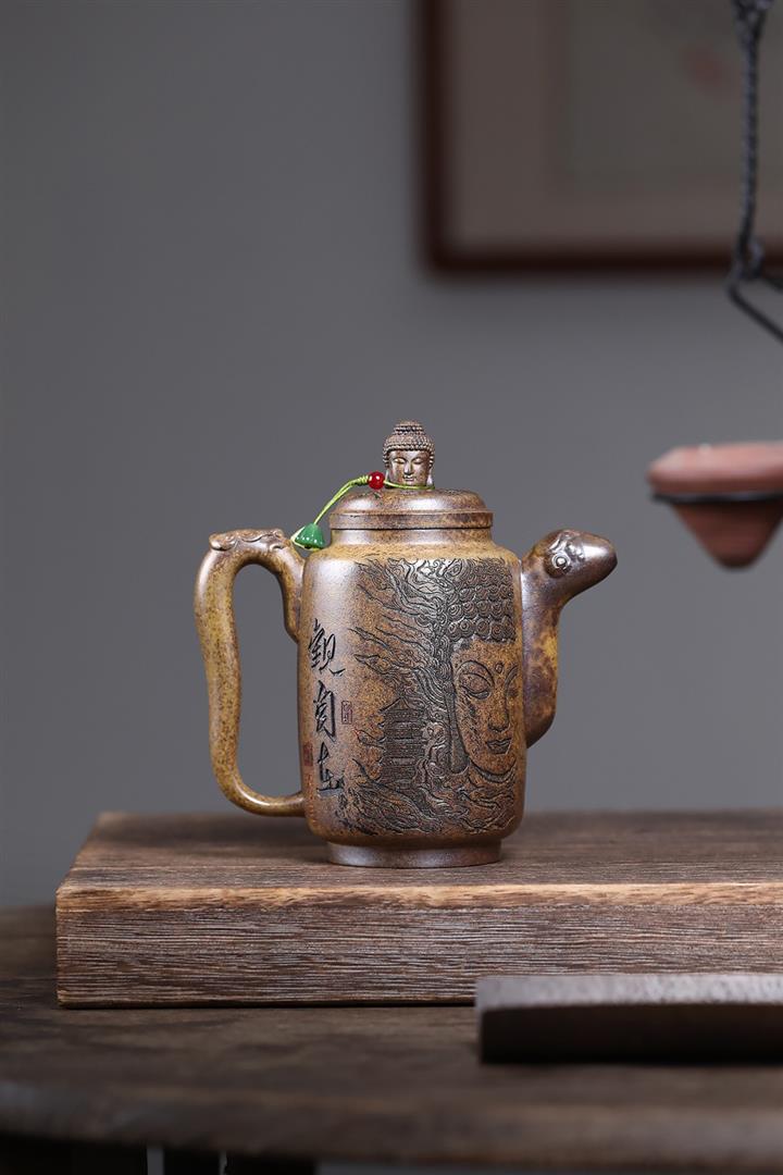 235cc原礦黃金段泥泥繪蓮蓬漢瓦茶壺POT8143