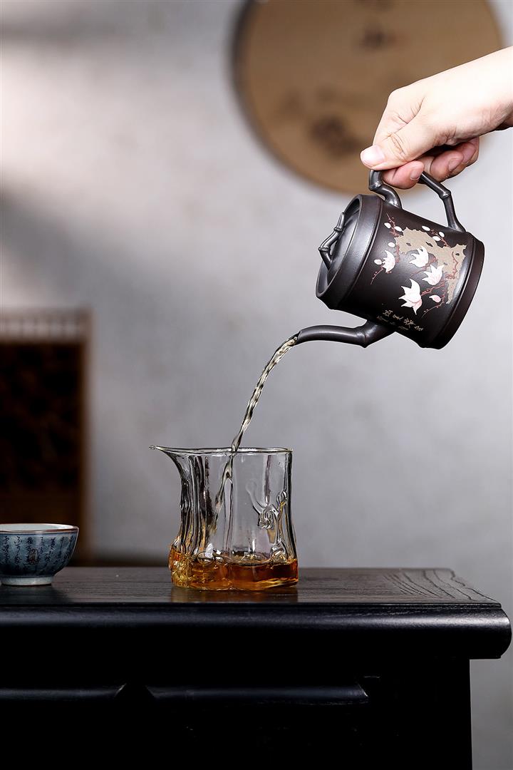 【泥料特點】砂土氣重,似淳實農民,日久使用,漸露鋒芒,養成變化,溫潤莊重。紫砂是壹種雙重氣孔結構的多孔性材質,氣孔微細,密度高。用紫砂壺沏茶,不失原味,且香不渙散,得茶之真香真味。紫砂使用越久,壺身色澤越發光亮照人,氣韻溫雅。紫砂壺長久使用器身會因撫摸擦拭,變得越發溫潤光澤。