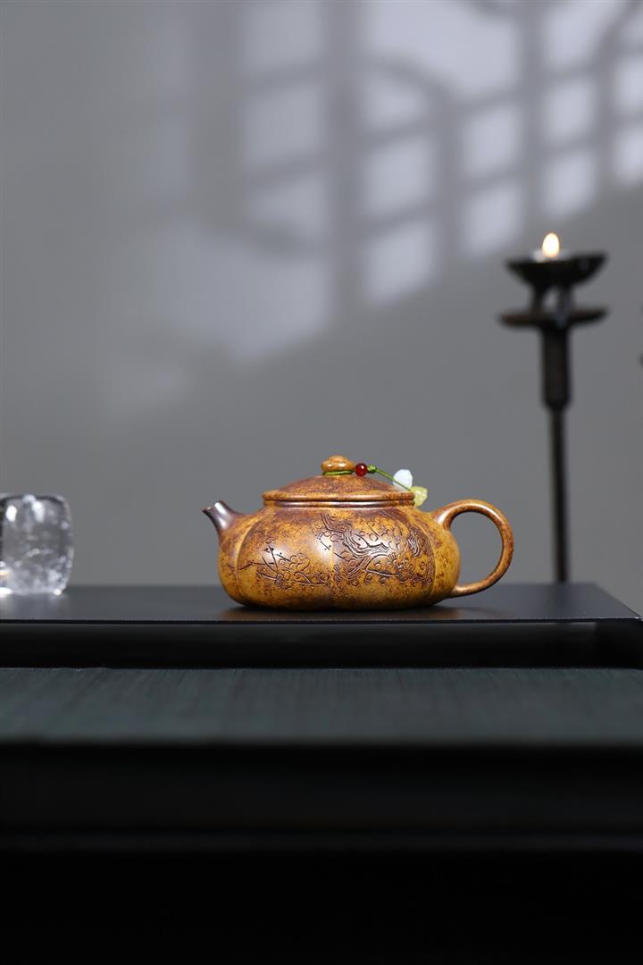 原礦綠泥刻繪太湖石竹趣茶壺POT7196