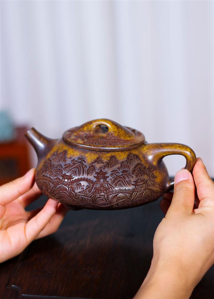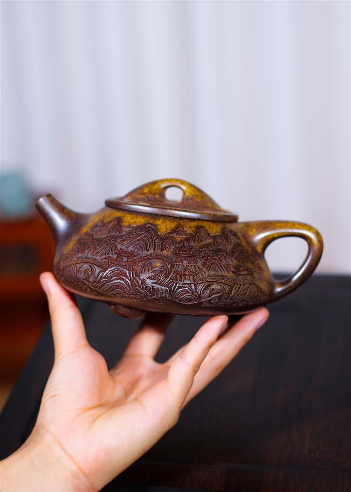 【作品介紹】此款壺形線條流暢,壺把,壺嘴,壺身壹氣呵成栩栩如生,是收藏把玩的好壺,泥料色澤古樸典雅,日久使用,漸露鋒芒,養成變化快,溫潤莊重,用其泡茶,使用的年代久,壺身就溫潤,泡出來的茶湯也就醇郁芳馨。