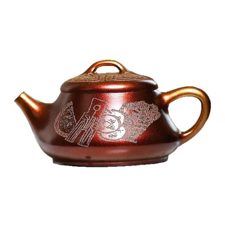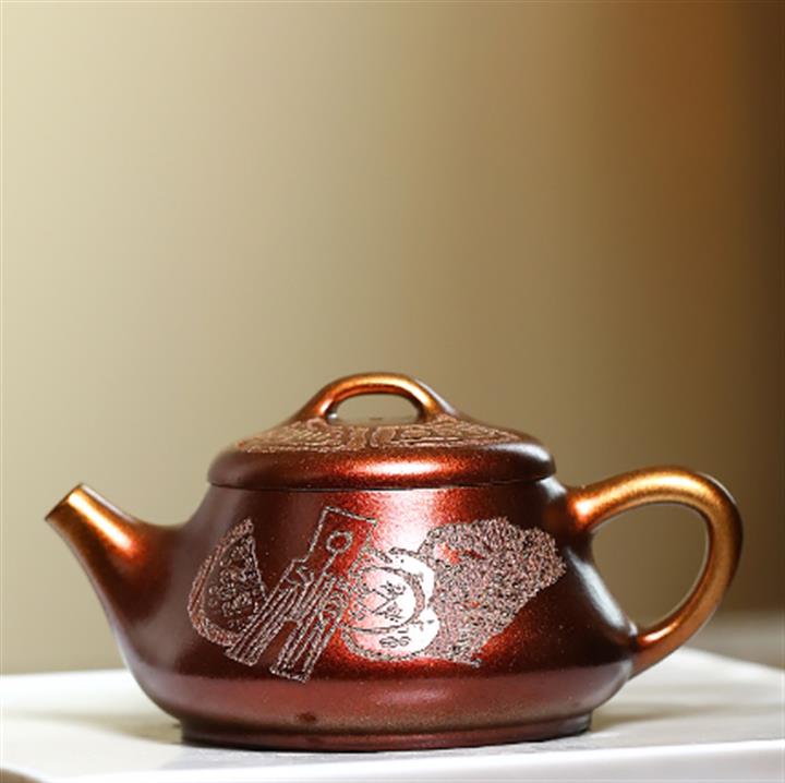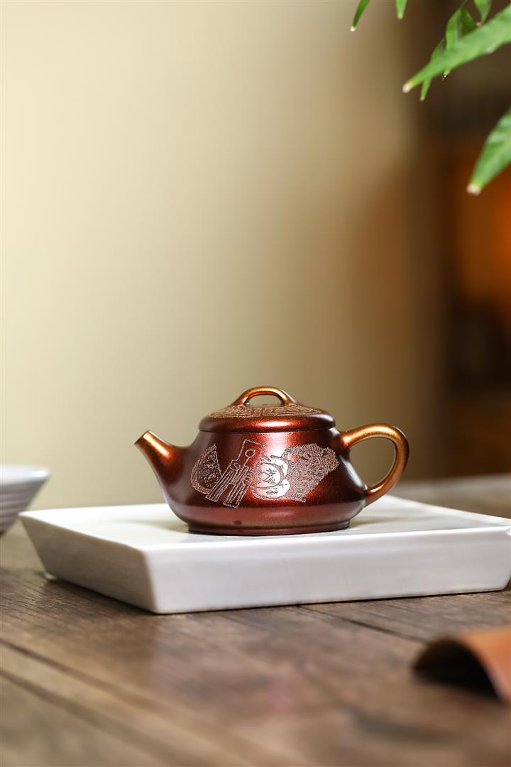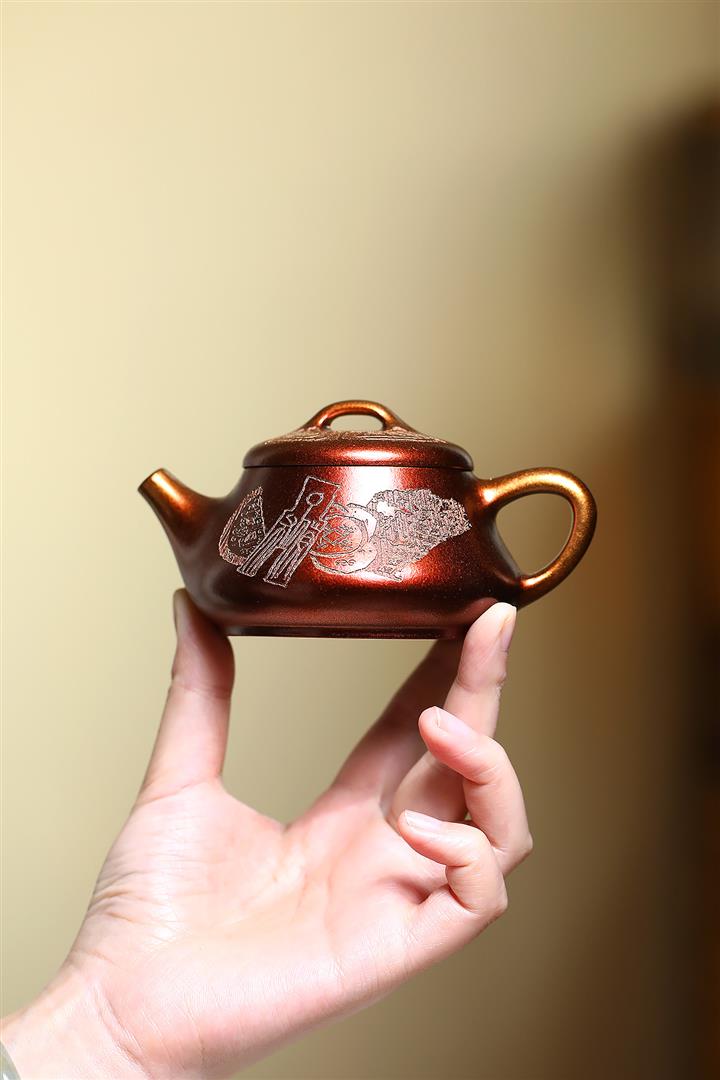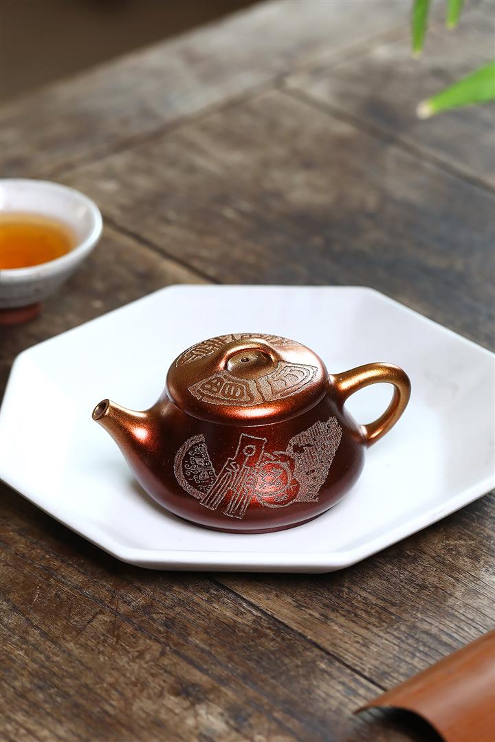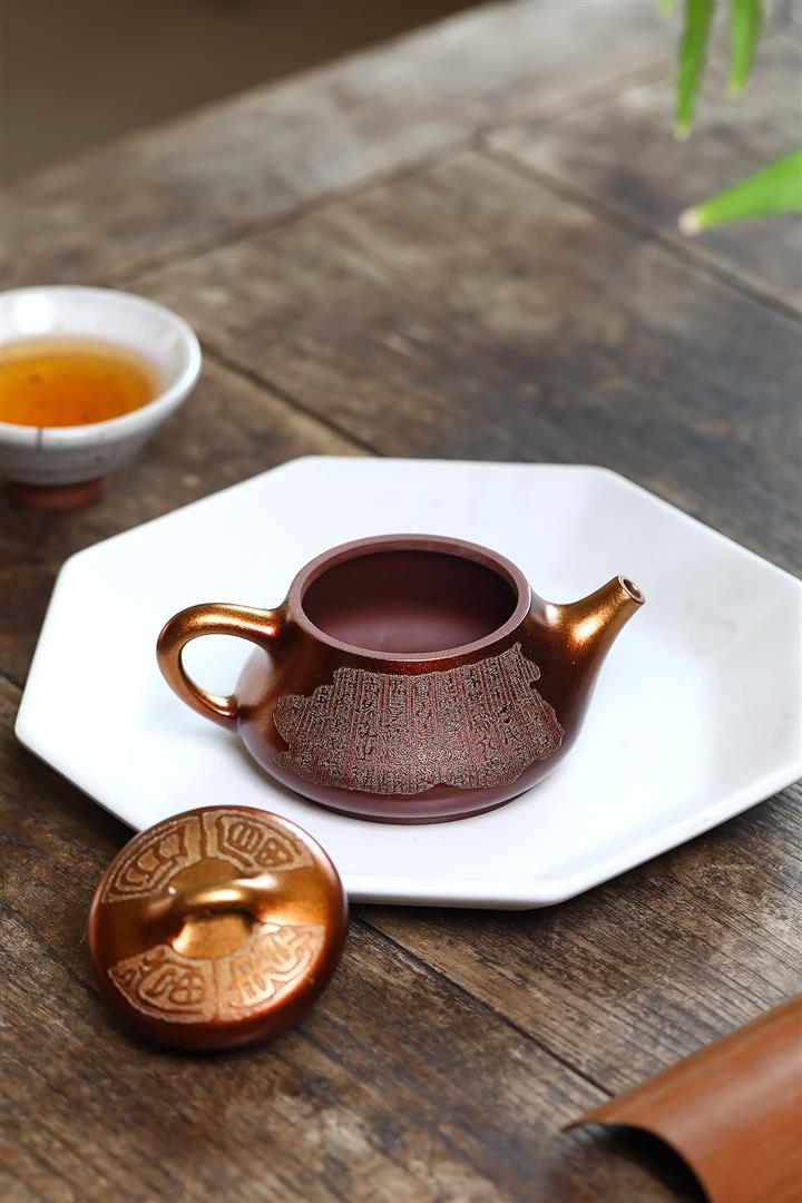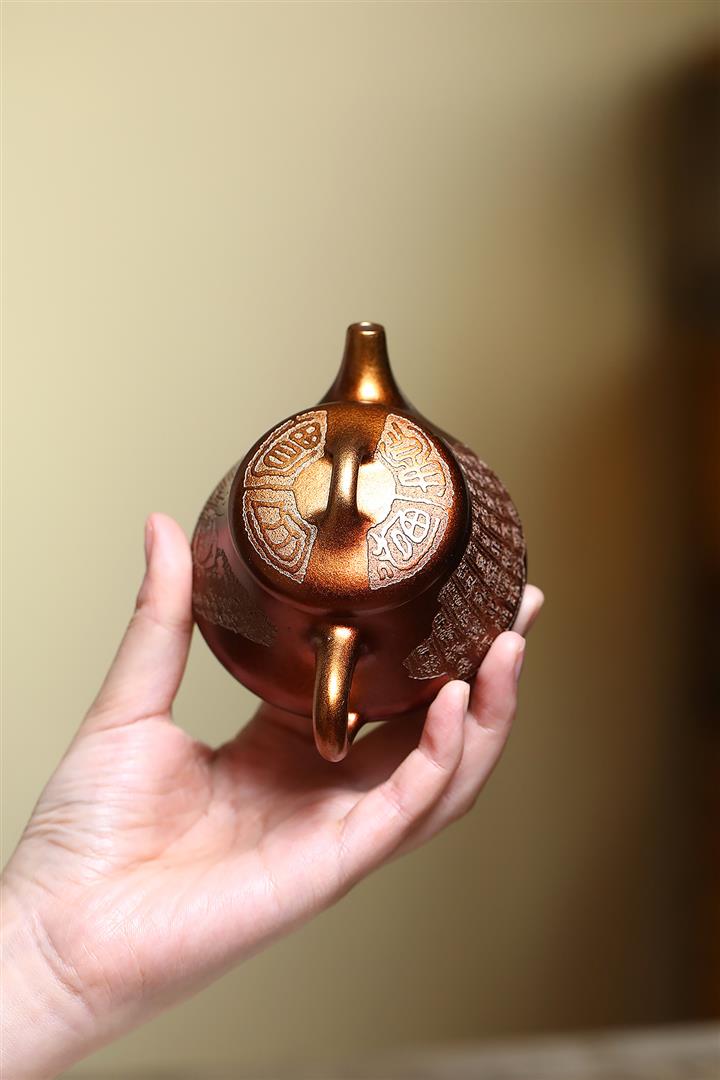原礦黑金砂手工蛇紋鎏金刻繪龍燈茶壺POT6774