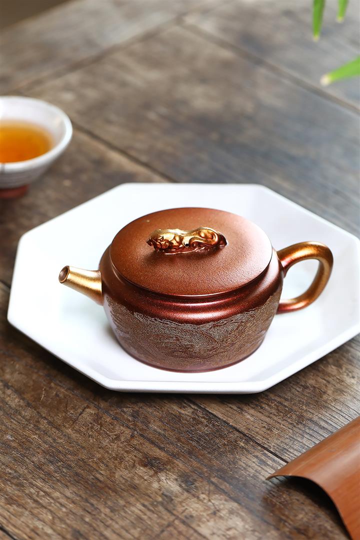 【泥料特點】砂土氣重,似淳實農民,日久使用,漸露鋒芒,養成變化,溫潤莊重。紫砂是壹種雙重氣孔結構的多孔性材質,氣孔微細,密度高。用紫砂壺沏茶,不失原味,且香不渙散,得茶之真香真味。紫砂使用越久,壺身色澤越發光亮照人,氣韻溫雅。紫砂壺長久使用器身會因撫摸擦拭,變得越發溫潤光澤。