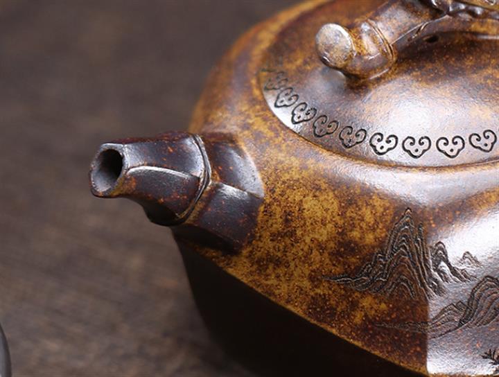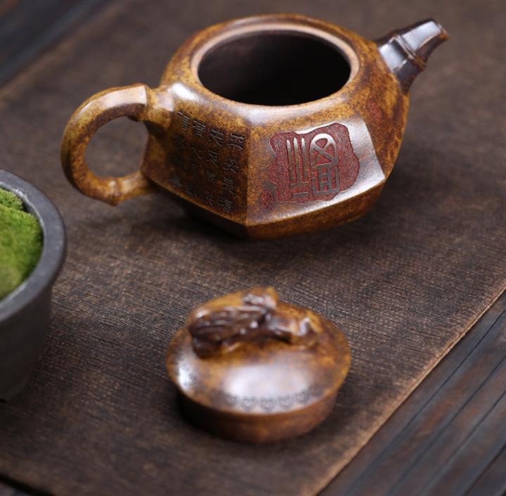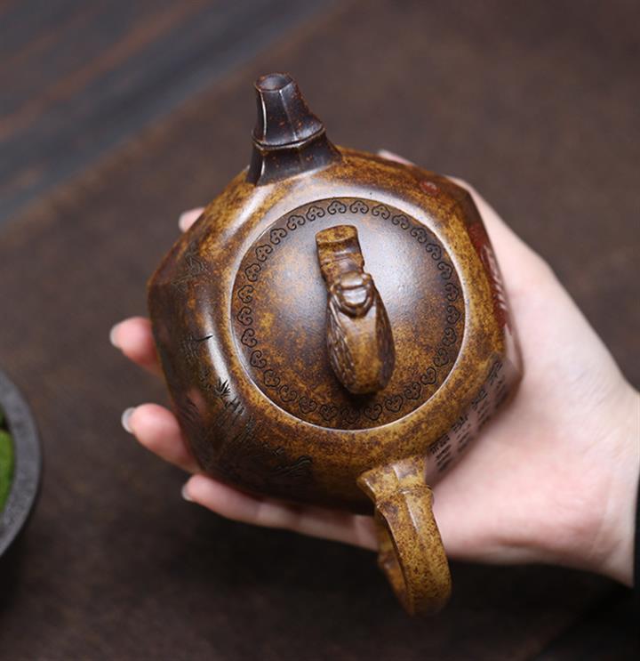 【泥料特點】砂土氣重,似淳實農民,日久使用,漸露鋒芒,養成變化,溫潤莊重。紫砂是壹種雙重氣孔結構的多孔性材質,氣孔微細,密度高。用紫砂壺沏茶,不失原味,且香不渙散,得茶之真香真味。紫砂使用越久,壺身色澤越發光亮照人,氣韻溫雅。紫砂壺長久使用器身會因撫摸擦拭,變得越發溫潤光澤。