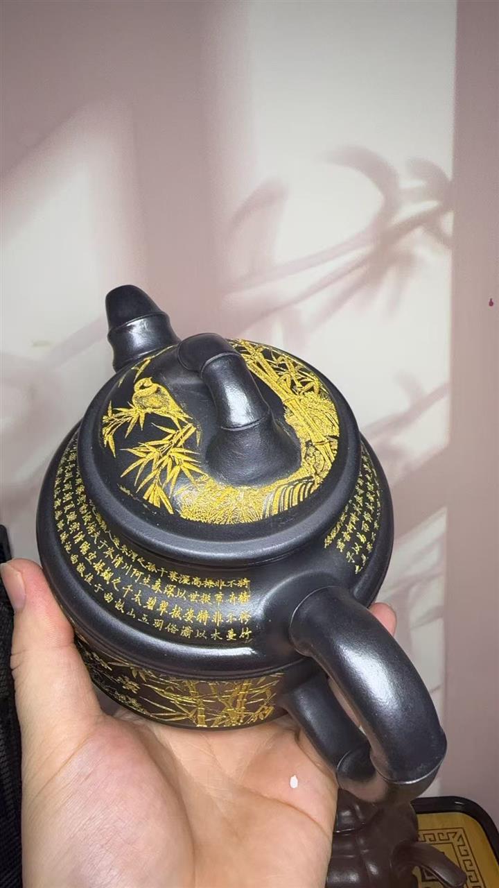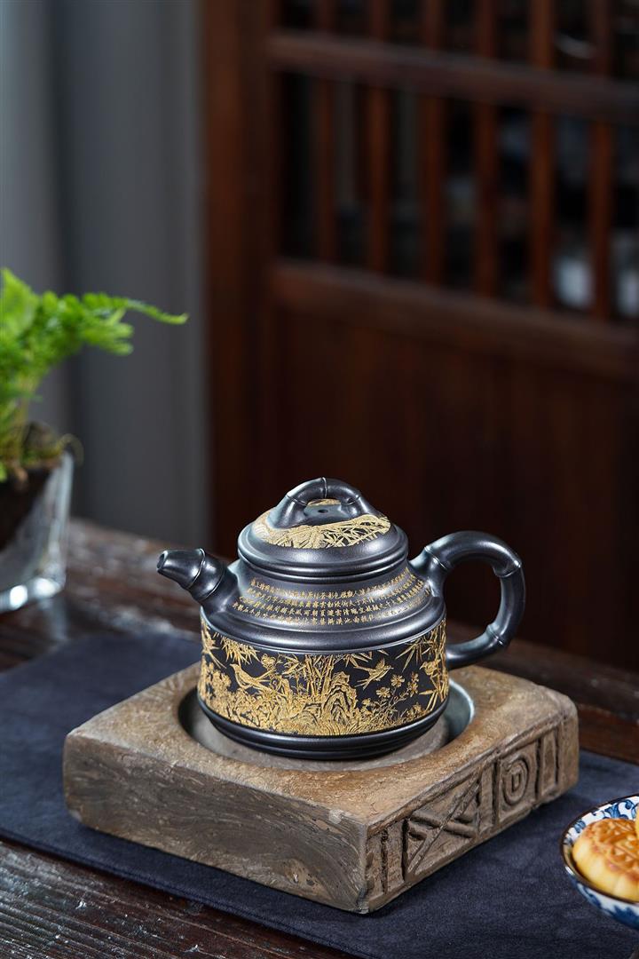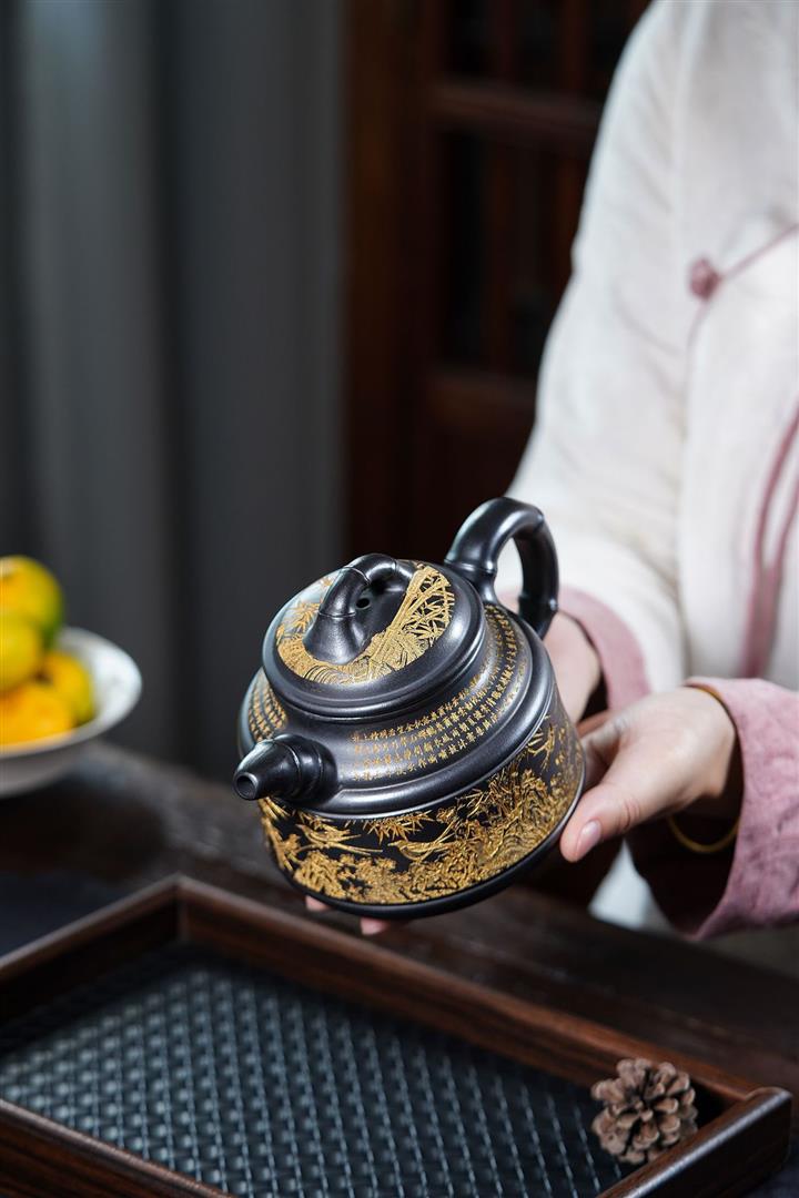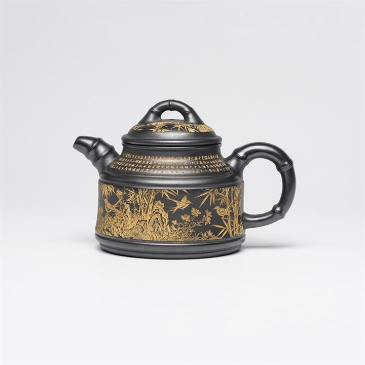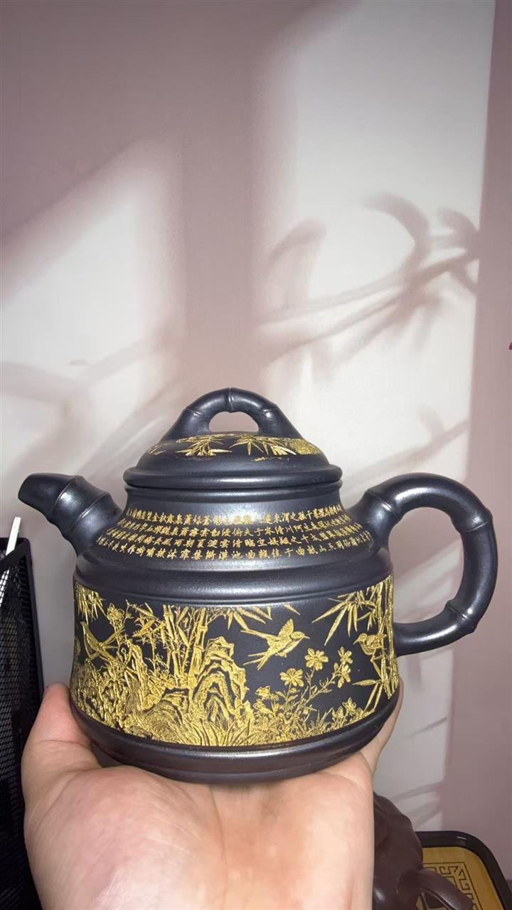 原礦石黃刻繪山水曲壺茶壺POT7683
