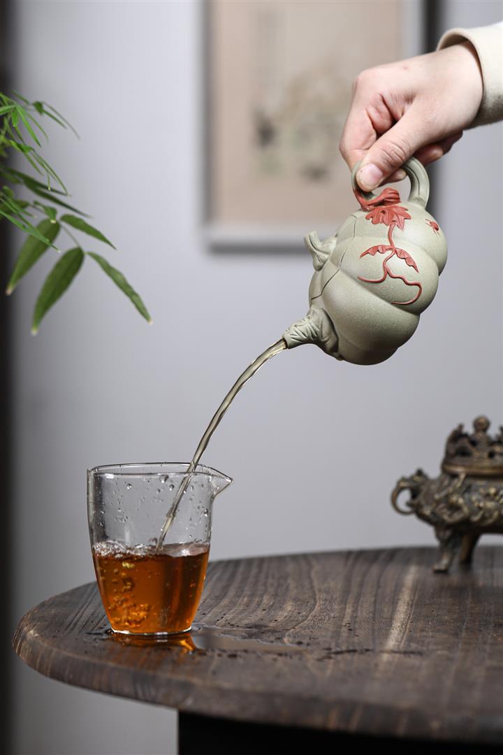 【泥料特點】砂土氣重,似淳實農民,日久使用,漸露鋒芒,養成變化,溫潤莊重。紫砂是壹種雙重氣孔結構的多孔性材質,氣孔微細,密度高。用紫砂壺沏茶,不失原味,且香不渙散,得茶之真香真味。紫砂使用越久,壺身色澤越發光亮照人,氣韻溫雅。紫砂壺長久使用器身會因撫摸擦拭,變得越發溫潤光澤。