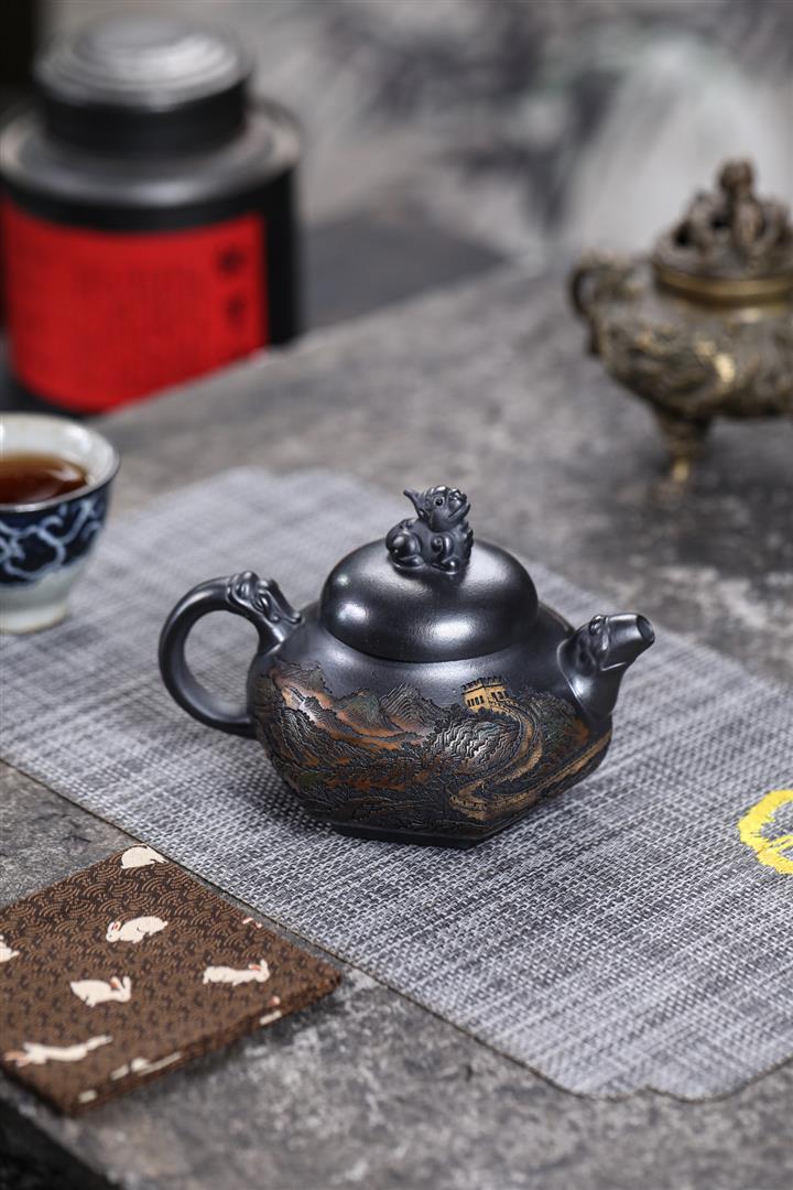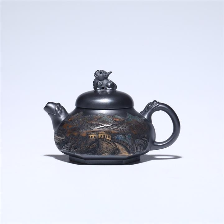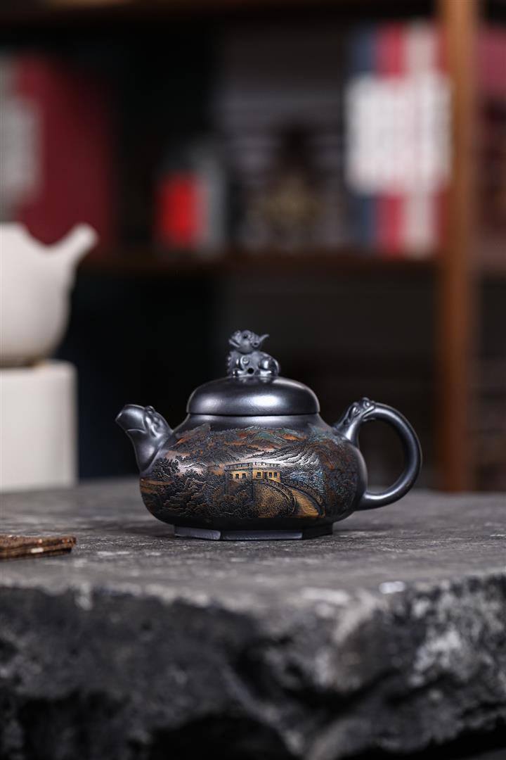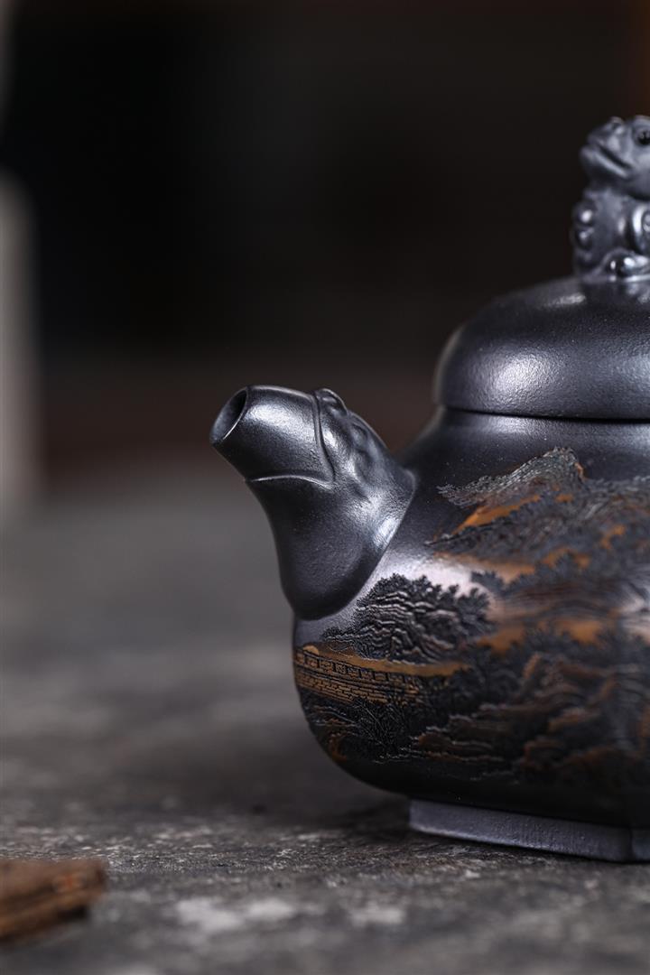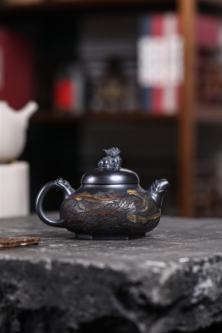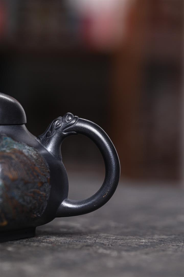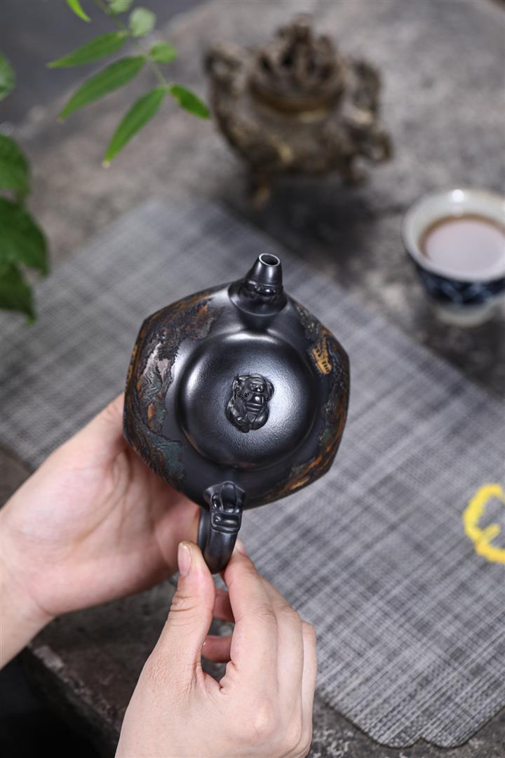 原礦墨綠泥四方福壽紫砂壺POT5567