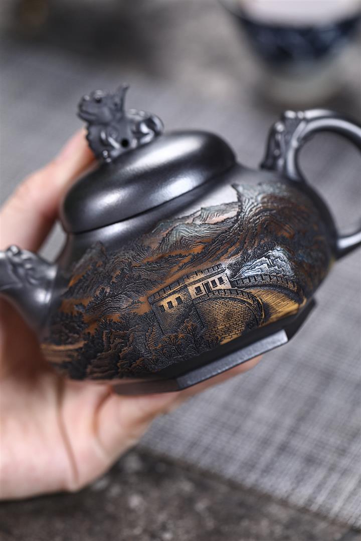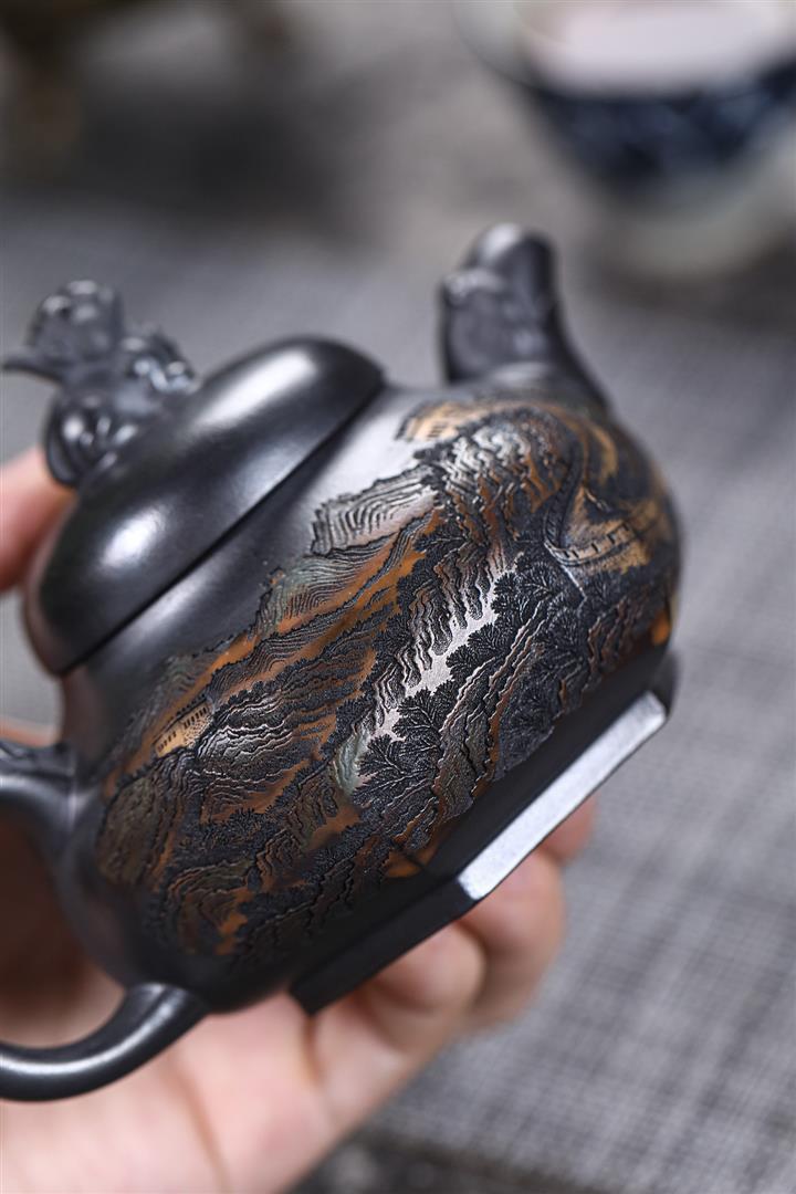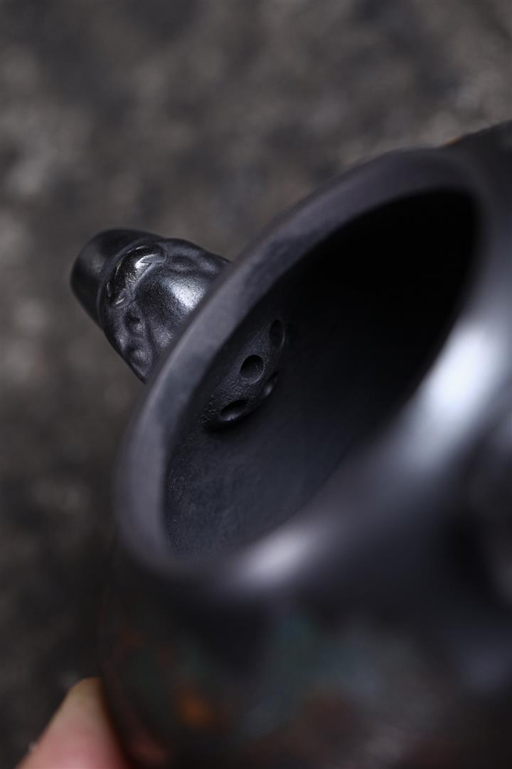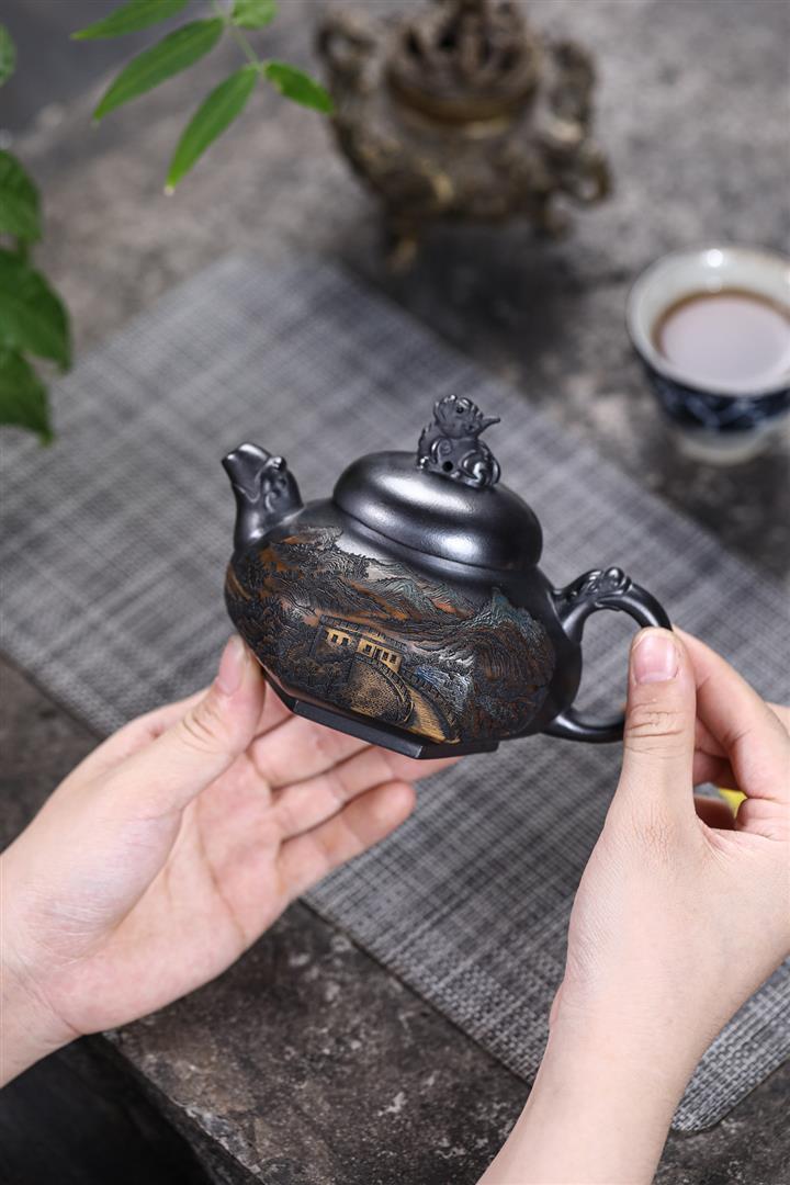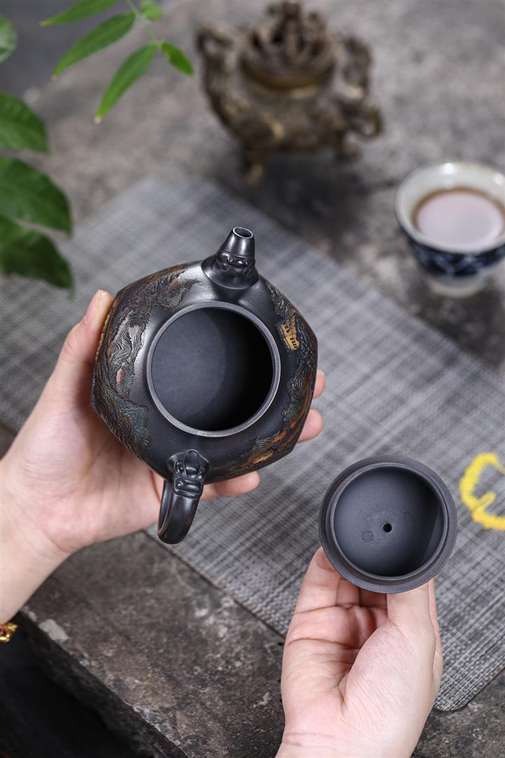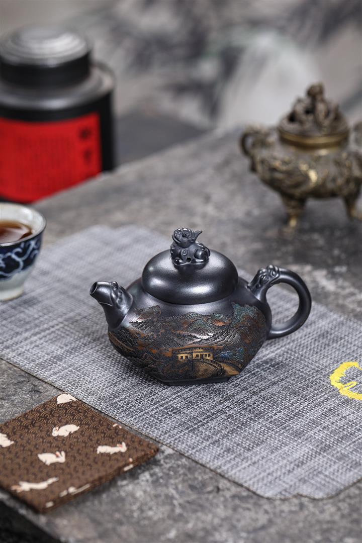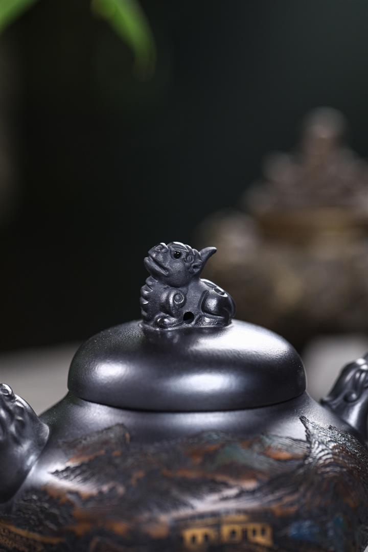 原礦墨綠泥四方福壽紫砂壺POT5567