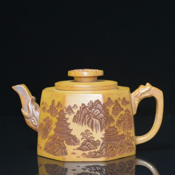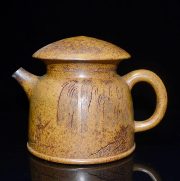290cc原礦古銅泥彩刻江山攬勝茶壺POT8383