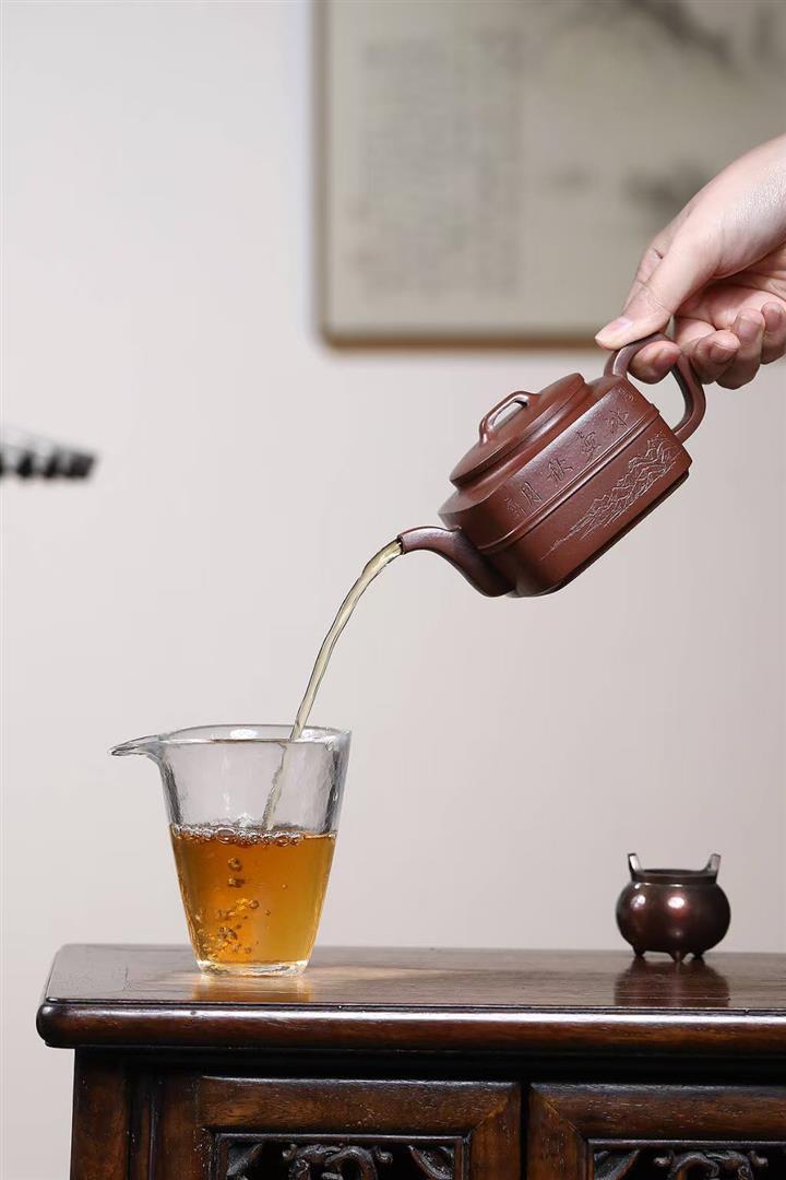 【泥料特點】砂土氣重,似淳實農民,日久使用,漸露鋒芒,養成變化,溫潤莊重。紫砂是壹種雙重氣孔結構的多孔性材質,氣孔微細,密度高。用紫砂壺沏茶,不失原味,且香不渙散,得茶之真香真味。紫砂使用越久,壺身色澤越發光亮照人,氣韻溫雅。紫砂壺長久使用器身會因撫摸擦拭,變得越發溫潤光澤。
