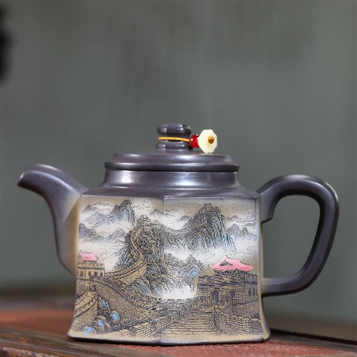 300cc原礦黑料六方金鐘滿彩刻長城泡茶壺POT9517