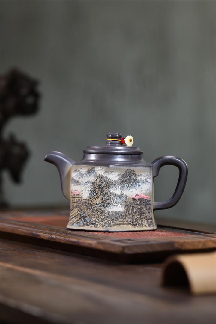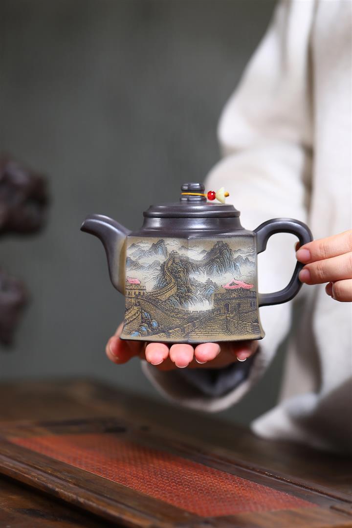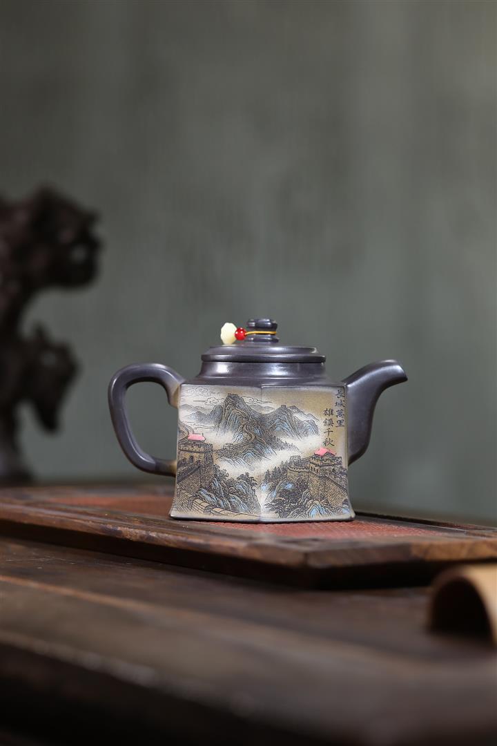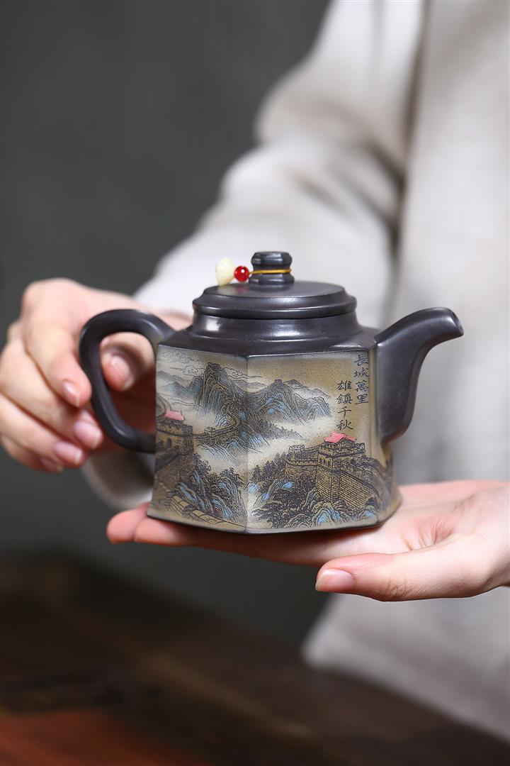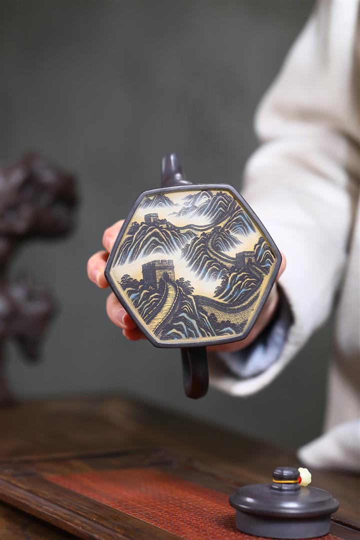 300cc原礦黑料六方金鐘滿彩刻長城泡茶壺POT9517