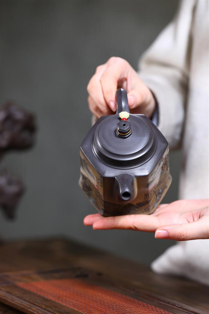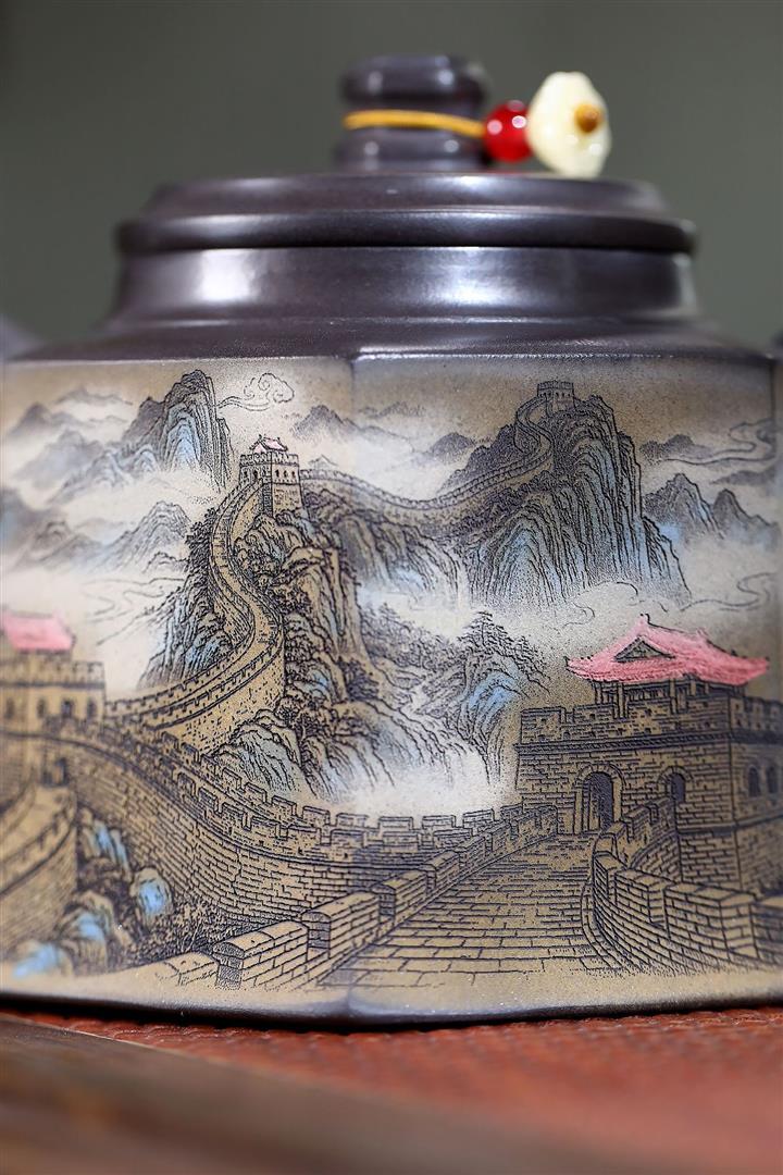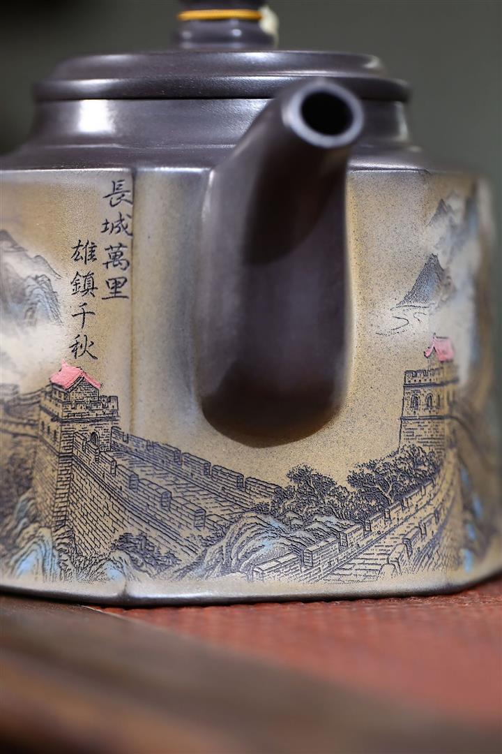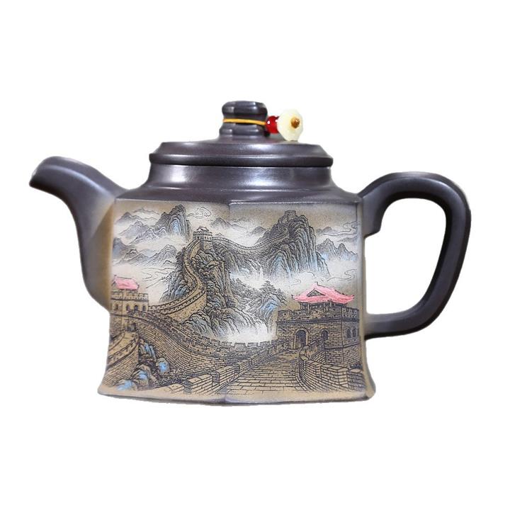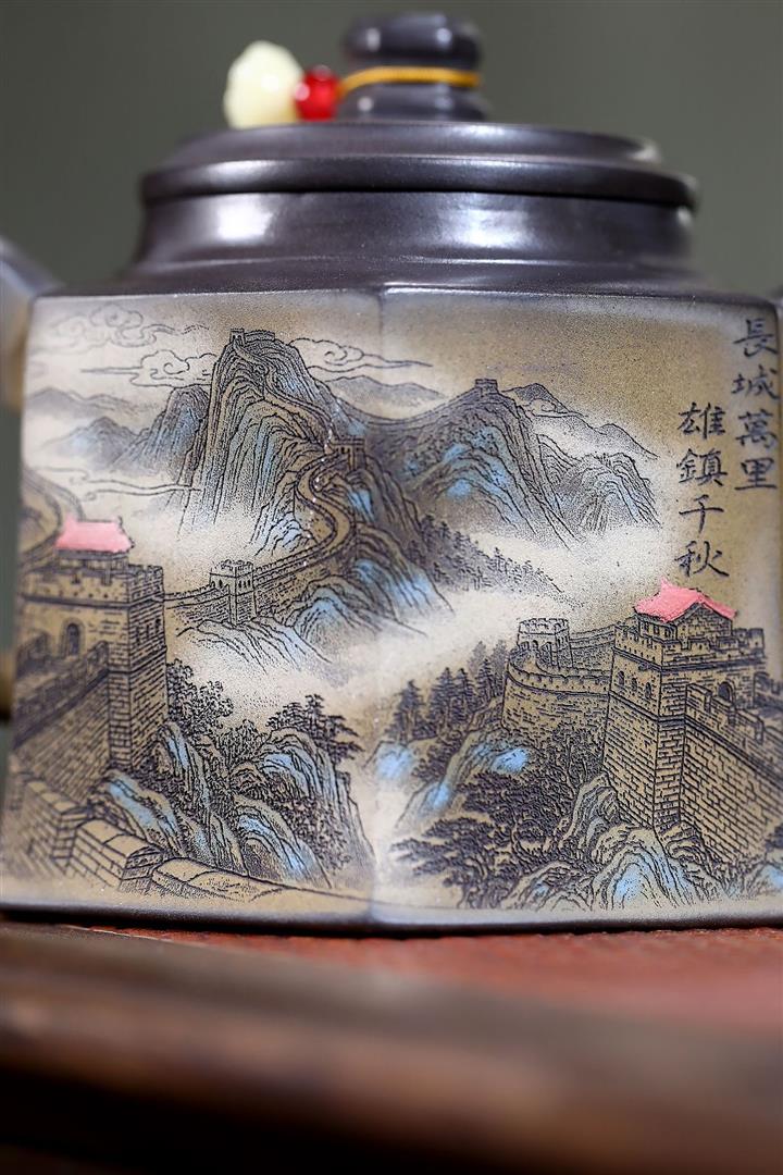 300cc原礦黑料六方金鐘滿彩刻長城泡茶壺POT9517