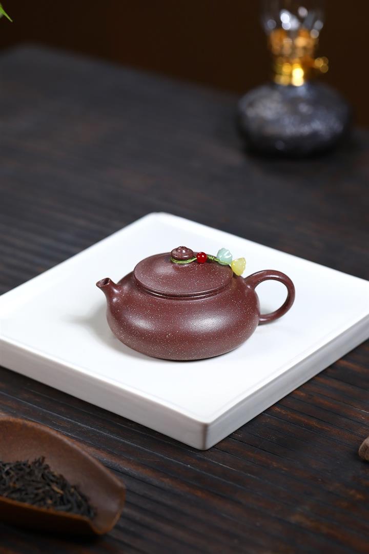 【泥料特點】砂土氣重,似淳實農民,日久使用,漸露鋒芒,養成變化,溫潤莊重。紫砂是壹種雙重氣孔結構的多孔性材質,氣孔微細,密度高。用紫砂壺沏茶,不失原味,且香不渙散,得茶之真香真味。紫砂使用越久,壺身色澤越發光亮照人,氣韻溫雅。紫砂壺長久使用器身會因撫摸擦拭,變得越發溫潤光澤。