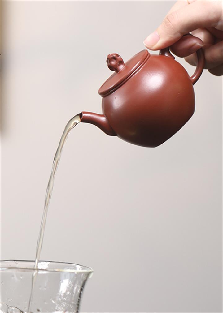 【泥料特點】砂土氣重,似淳實農民,日久使用,漸露鋒芒,養成變化,溫潤莊重。紫砂是壹種雙重氣孔結構的多孔性材質,氣孔微細,密度高。用紫砂壺沏茶,不失原味,且香不渙散,得茶之真香真味。紫砂使用越久,壺身色澤越發光亮照人,氣韻溫雅。紫砂壺長久使用器身會因撫摸擦拭,變得越發溫潤光澤。