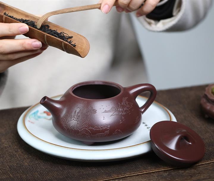 【泥料特點】砂土氣重,似淳實農民,日久使用,漸露鋒芒,養成變化,溫潤莊重。紫砂是壹種雙重氣孔結構的多孔性材質,氣孔微細,密度高。用紫砂壺沏茶,不失原味,且香不渙散,得茶之真香真味。紫砂使用越久,壺身色澤越發光亮照人,氣韻溫雅。紫砂壺長久使用器身會因撫摸擦拭,變得越發溫潤光澤。