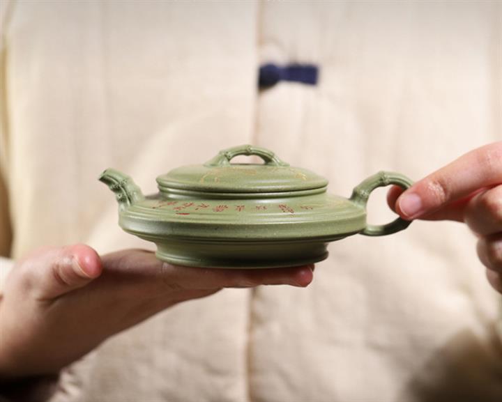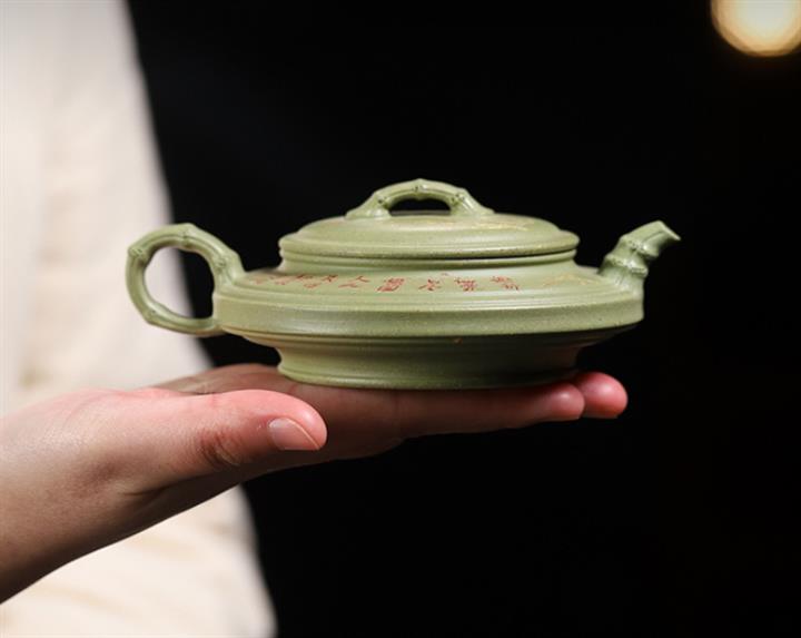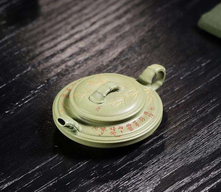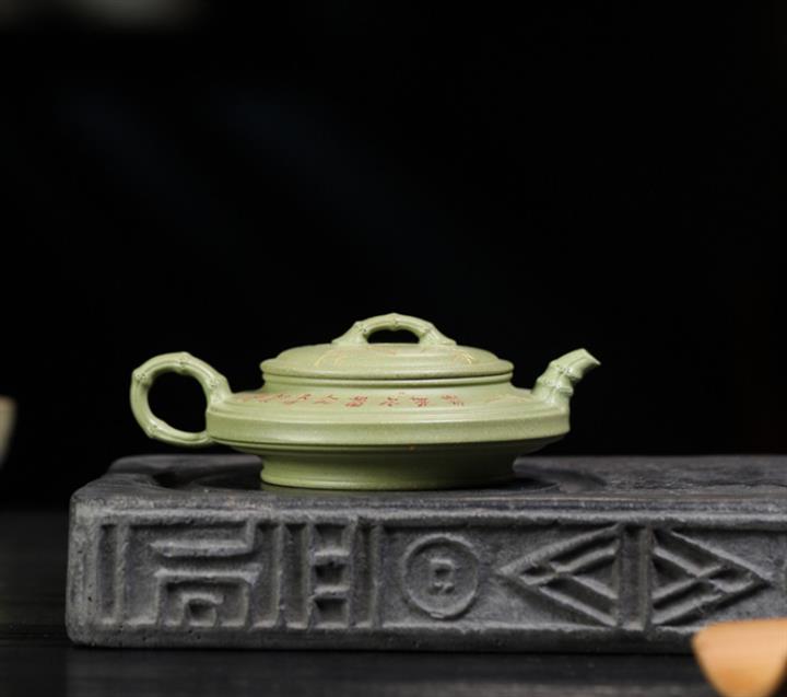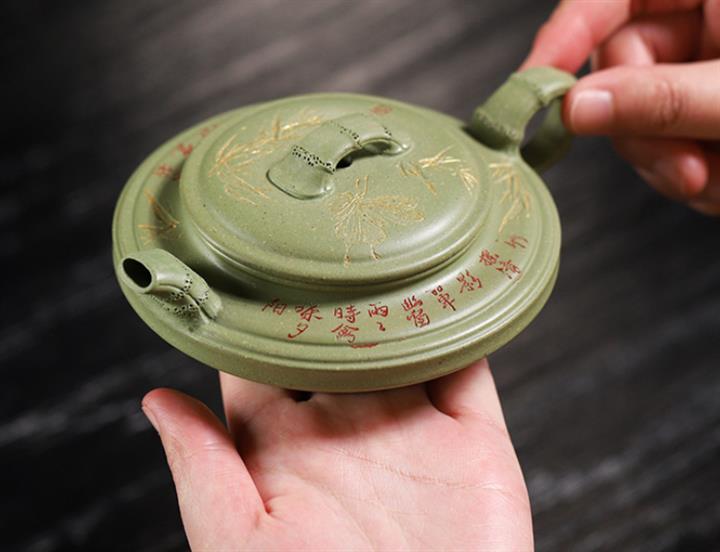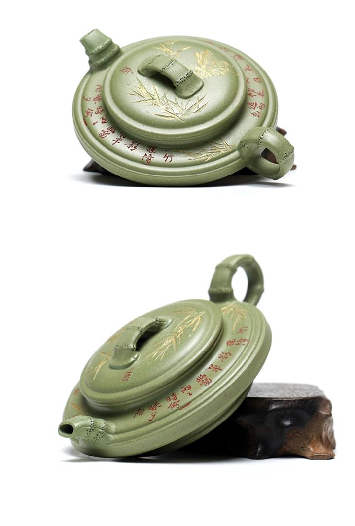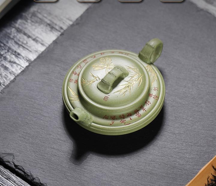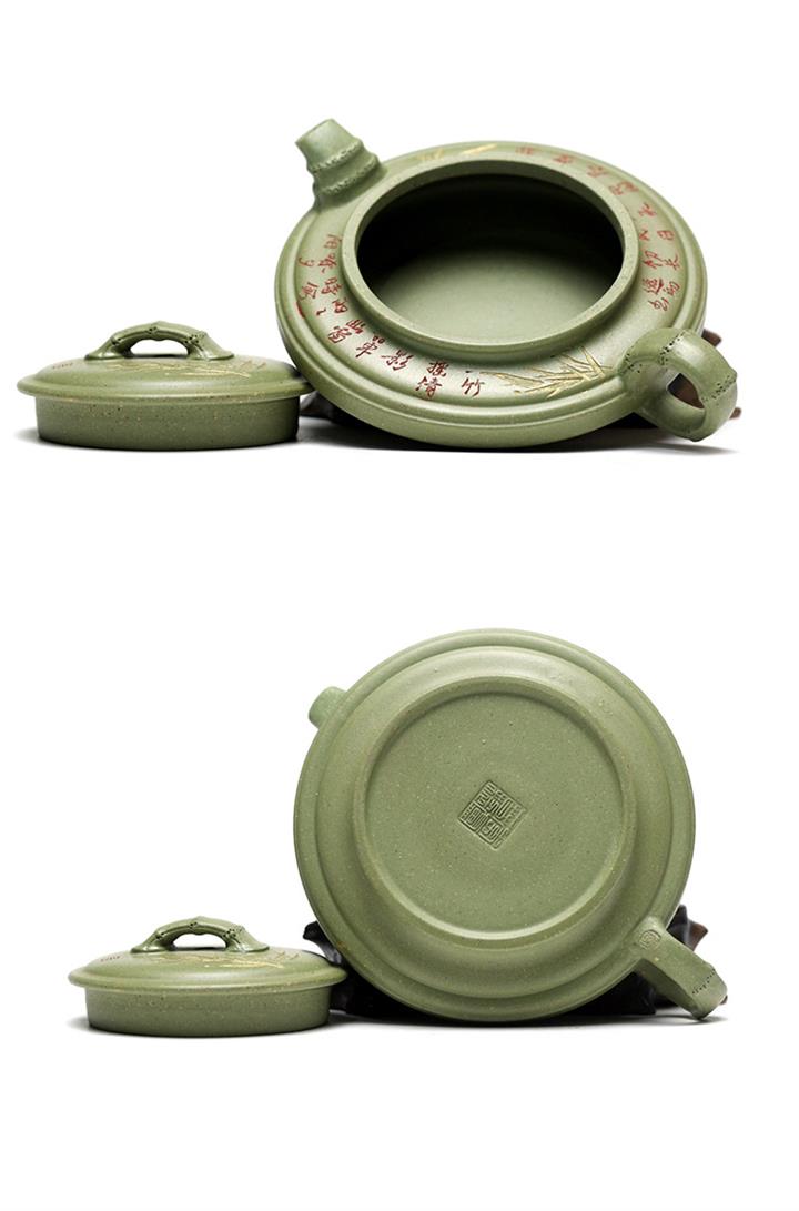180cc原礦豆青砂竹刻虛扁泡茶壺POT9784