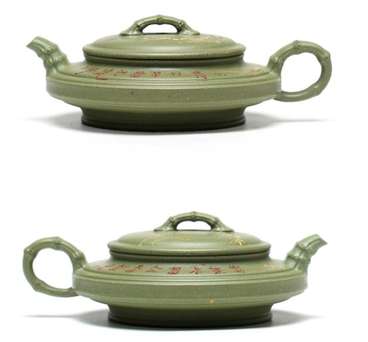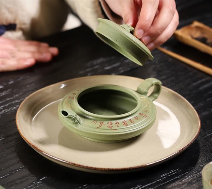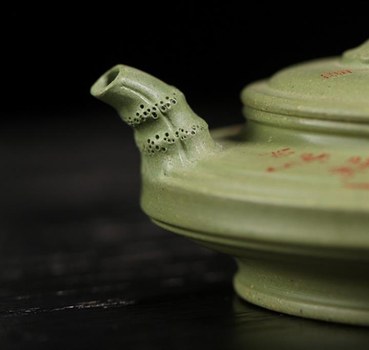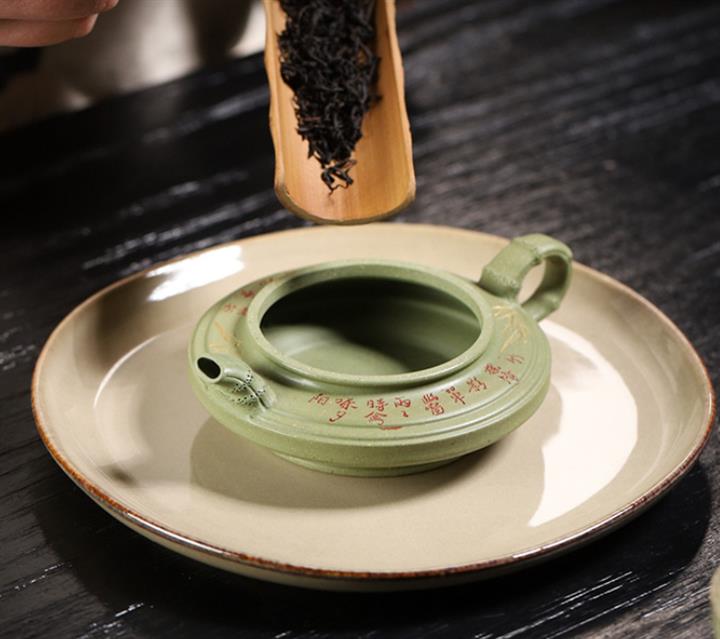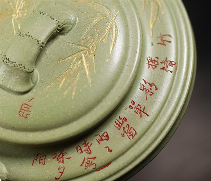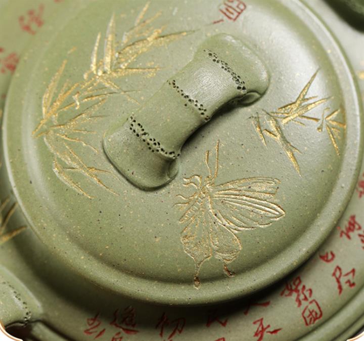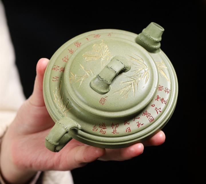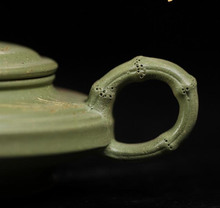 180cc原礦豆青砂竹刻虛扁泡茶壺POT9784