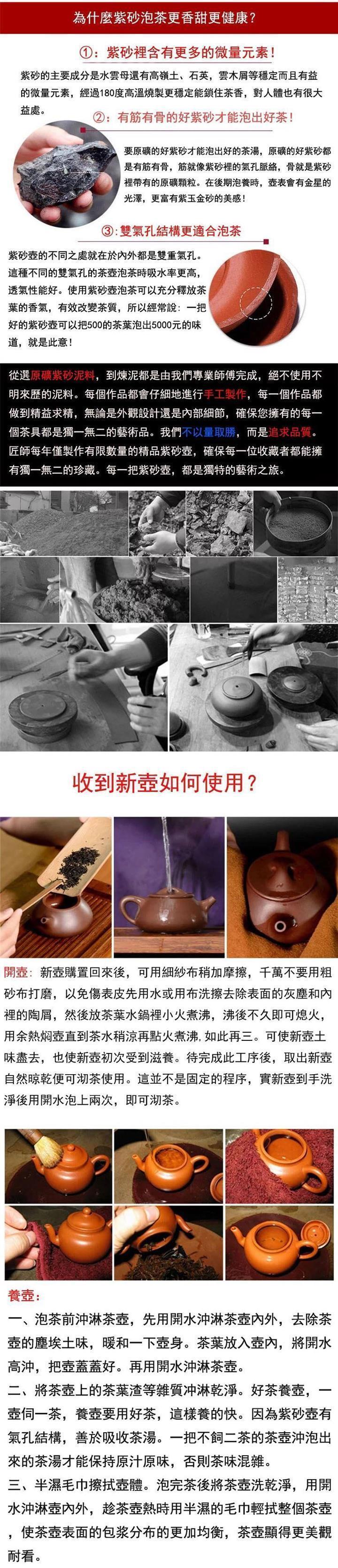 【泥料特點】砂土氣重,似淳實農民,日久使用,漸露鋒芒,養成變化,溫潤莊重。紫砂是壹種雙重氣孔結構的多孔性材質,氣孔微細,密度高。用紫砂壺沏茶,不失原味,且香不渙散,得茶之真香真味。紫砂使用越久,壺身色澤越發光亮照人,氣韻溫雅。紫砂壺長久使用器身會因撫摸擦拭,變得越發溫潤光澤。